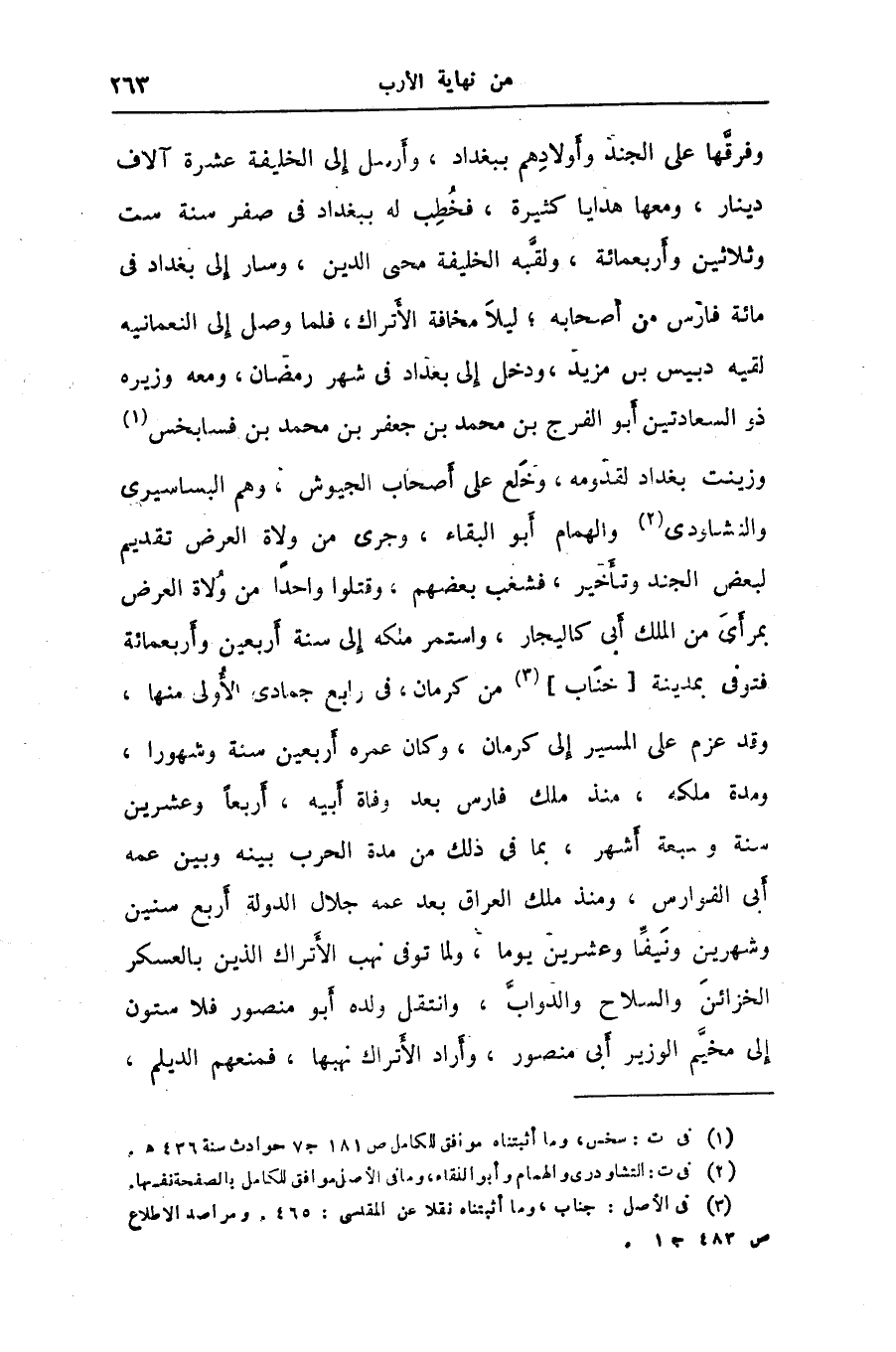 وفرقّها على الجند وأولادهم ببغداد، وأرسل إلى الخليفة عشرة آلاف دينار، ومعها هدايا كثيرة، فخطب له ببغداد في صفر سنة ست وثلاثين وأربعمائة، ولقّبه الخليفة محيى الدين، وسار إلى بغداد في مائة فارس من أصحابه؛ ليلا مخافة الأتراك، فلما وصل إلى النعمانيه لقيه دبيس بن مزيد، ودخل إلى بغداد في شهر رمضان، ومعه وزيره ذو السعادتين أبو الفرج بن محمد بن جعفر بن محمد بن فسابخس «1» وزينت بغداد لقدومه، وخلع على أصحاب الجيوش، وهم البساسيرى والنشاودى «2» والهمام أبو البقاء، وجرى من ولاة العرض تقديم لبعض الجند وتأخير، فشغب بعضهم، وقتلوا واحدا من ولاة العرض بمرأى من الملك أبى كاليجار، واستمر ملكه إلى سنة أربعين وأربعمائة فتوفى بمدينة [خناب] «3» من كرمان، فى رابع جمادى الأولى منها، وقد عزم على المسير إلى كرمان، وكان عمره أربعين سنة وشهورا، ومدة ملكه، منذ ملك فارس بعد وفاة أبيه، أربعا وعشرين سنة وسبعة أشهر، بما في ذلك من مدة الحرب بينه وبين عمه أبى الفوارس، ومنذ ملك العراق بعد عمه جلال الدولة أربع سنين وشهرين ونيّفا وعشرين يوما، ولما توفى نهب الأتراك الذين بالعسكر الخزائن والسلاح والدوابّ، وانتقل ولده أبو منصور فلا ستون إلى مخيّم الوزير أبى منصور، وأراد الأتراك نهبها، فمنعهم الديلم،