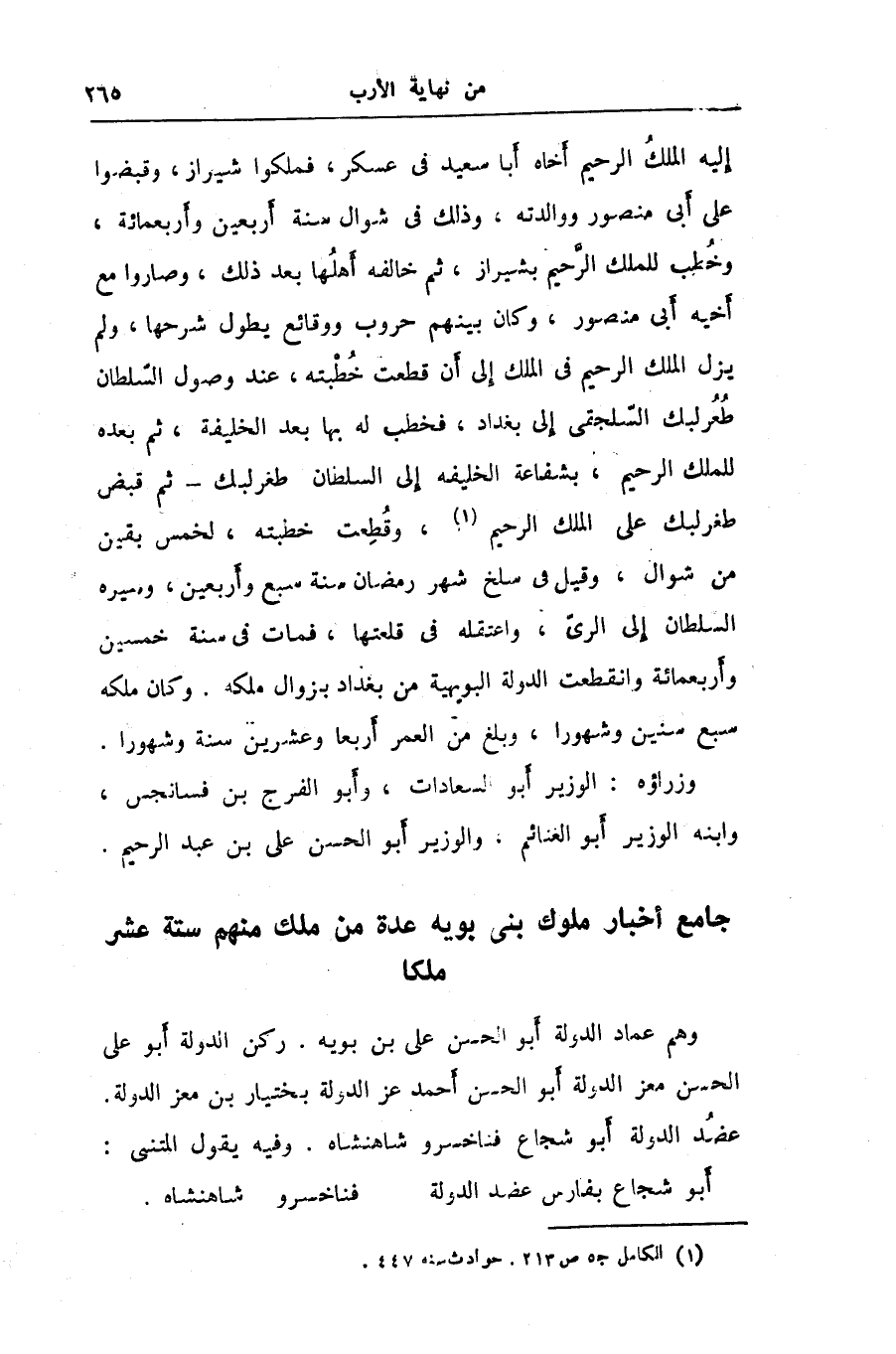 إليه الملك الرحيم أخاه أبا سعيد في عسكر، فملكوا شيراز، وقبضوا على أبى منصور ووالدته، وذلك في شوال سنة أربعين وأربعمائة، وخطب للملك الرّحيم بشيراز، ثم خالفه أهلها بعد ذلك، وصاروا مع أخيه أبى منصور، وكان بينهم حروب ووقائع يطول شرحها، ولم يزل الملك الرحيم في الملك إلى أن قطعت خطبته، عند وصول السّلطان طغرلبك السّلجقى إلى بغداد، فخطب له بها بعد الخليفة، ثم بعده للملك الرحيم، بشفاعة الخليفه إلى السلطان طغرلبك- ثم قبض طغرلبك على الملك الرحيم «1» ، وقطعت خطبته، لخمس بقين من شوال، وقيل في سلخ شهر رمضان سنة سبع وأربعين، وسيره السلطان إلى الرىّ، واعتقله في قلعتها، فمات في سنة خمسين وأربعمائة وانقطعت الدولة البويهية من بغداد بزوال ملكه. وكان ملكه سبع سنين وشهورا، وبلغ من العمر أربعا وعشرين سنة وشهورا.