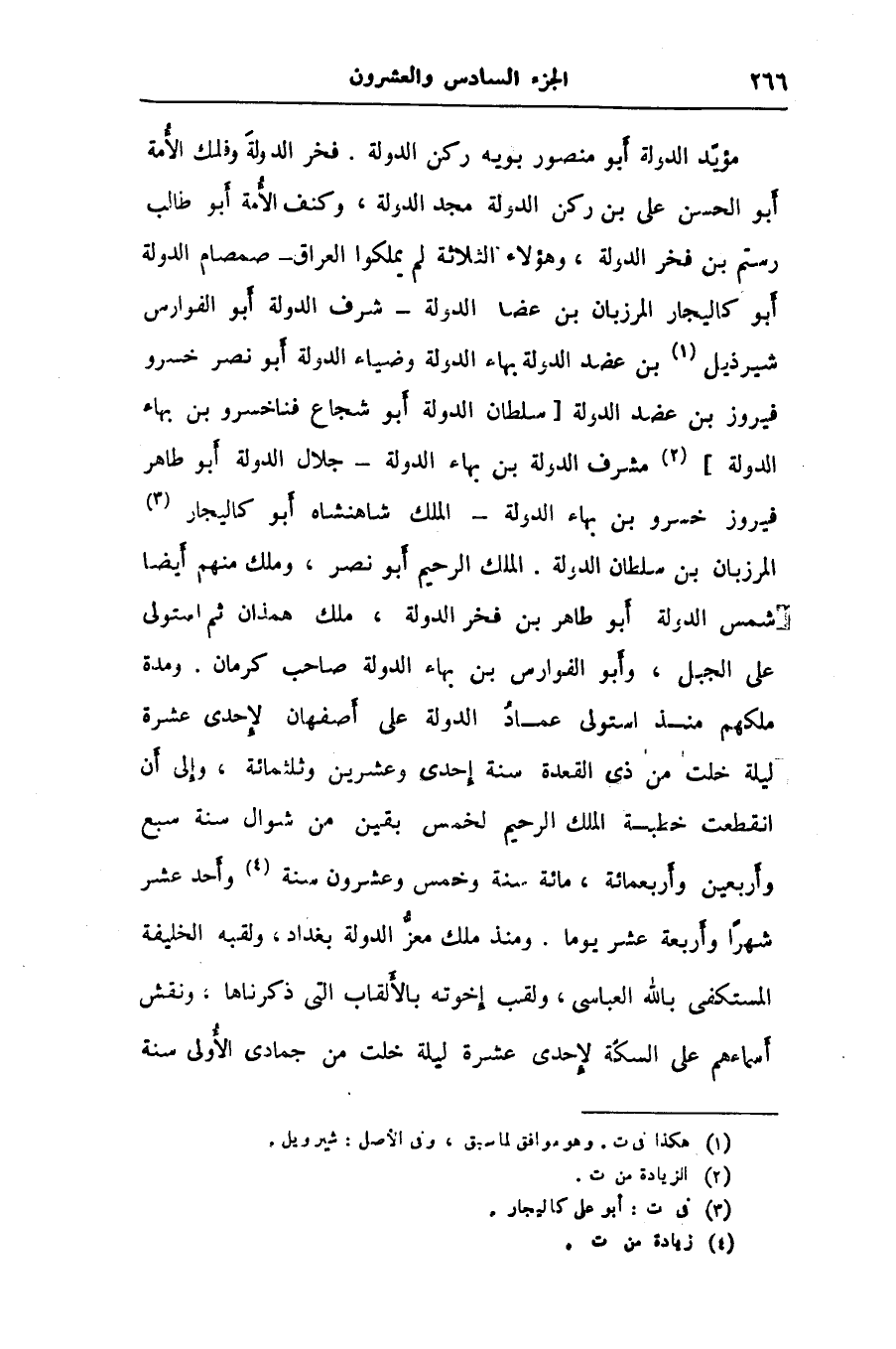 مؤيّد الدولة أبو منصور بويه ركن الدولة. فخر الدولة وفلك الأمة أبو الحسن على بن ركن الدولة مجد الدولة، وكنف الأمة أبو طالب رستم بن فخر الدولة، وهؤلاء الثلاثة لم يملكوا العراق- صمصام الدولة أبو كاليجار المرزبان بن عضد الدولة- شرف الدولة أبو الفوارس شيرذيل «1» بن عضد الدولة بهاء الدولة وضياء الدولة أبو نصر خسرو فيروز بن عضد الدولة [سلطان الدولة أبو شجاع فناخسرو بن بهاء الدولة] «2» مشرف الدولة بن بهاء الدولة- جلال الدولة أبو طاهر فيروز خسرو بن بهاء الدولة- الملك شاهنشاه أبو كاليجار «3» المرزبان بن سلطان الدولة. الملك الرحيم أبو نصر، وملك منهم أيضا شمس الدولة أبو طاهر بن فخر الدولة، ملك همذان ثم استولى على الجبل، وأبو الفوارس بن بهاء الدولة صاحب كرمان. ومدة ملكهم منذ استولى عماد الدولة على أصفهان لإحدى عشرة ليلة خلت من ذى القعدة سنة إحدى وعشرين وثلاثمائة، وإلى أن انقطعت خطبة الملك الرحيم لخمس بقين من شوال سنة سبع وأربعين وأربعمائة، مائة سنة وخمس وعشرون سنة «4» وأحد عشر شهرا وأربعة عشر يوما. ومنذ ملك معزّ الدولة بغداد، ولقبه الخليفة المستكفى بالله العباسى، ولقب إخوته بالألقاب التى ذكرناها، ونقش أسماءهم على السكّة لإحدى عشرة ليلة خلت من جمادى الأولى سنة
