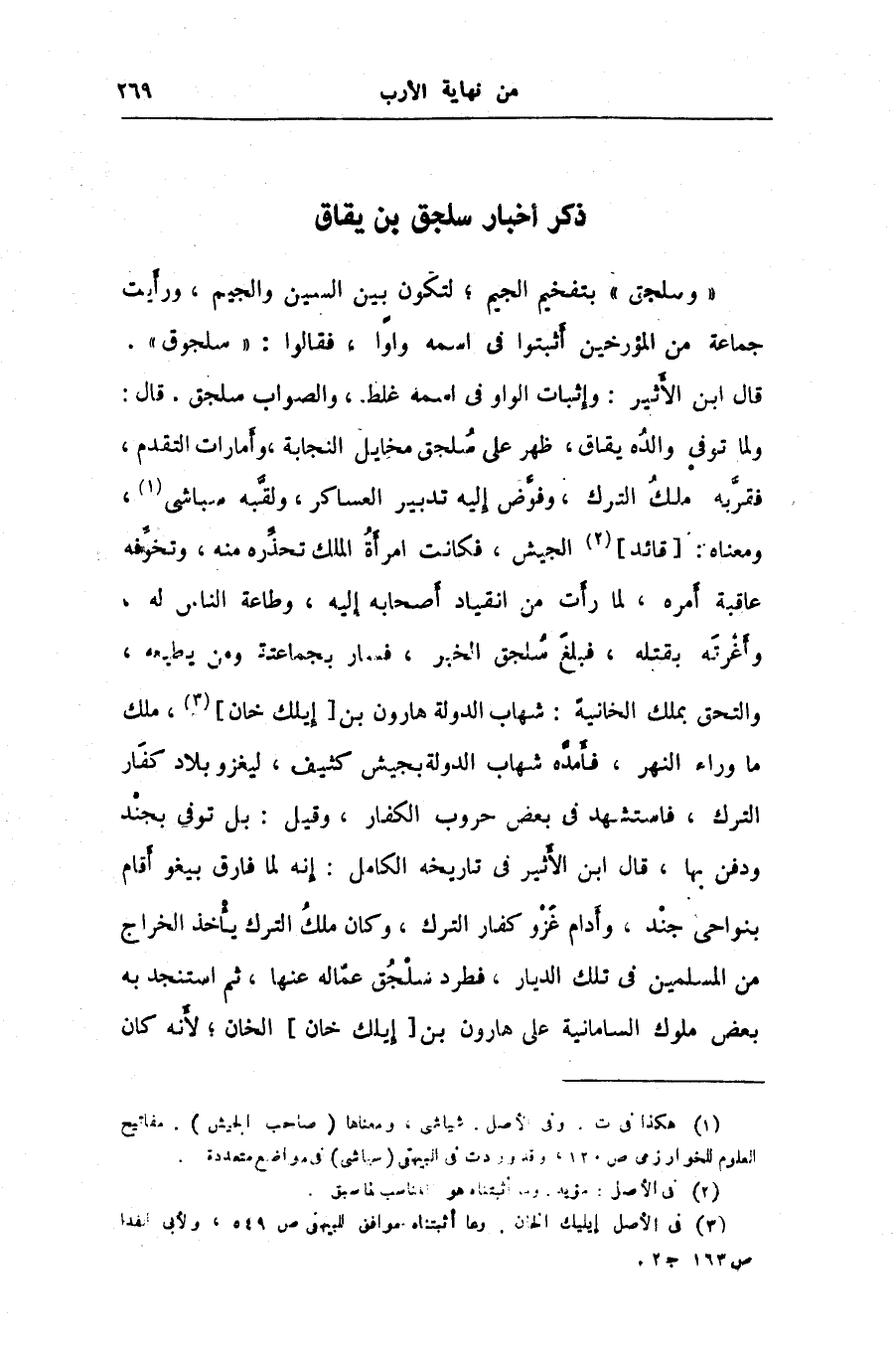 ولما توفى والده يقاق، ظهر على سلجق مخايل النجابة، وأمارات التقدم، فقرّبه ملك الترك، وفوّض إليه تدبير العساكر، ولقّبه سباشى «1» ، ومعناه: [قائد] «2» الجيش، فكانت امرأة الملك تحذّره منه، وتخوّفه عاقبة أمره، لما رأت من انقياد أصحابه إليه، وطاعة الناس له، وأغرته بقتله، فبلغ سلجق الخبر، فسار بجماعتة ومن يطيعه، والتحق بملك الخانية: شهاب الدولة هارون بن [إيلك خان] «3» ، ملك ما وراء النهر، فأمدّه شهاب الدولة بجيش كثيف، ليغزو بلاد كفار الترك، فاستشهد في بعض حروب الكفار، وقيل: بل توفى بجند ودفن بها، قال ابن الأثير في تاريخه الكامل: إنه لما فارق بيغو أقام بنواحى جند، وأدام غزو كفار الترك، وكان ملك الترك يأخذ الخراج من المسلمين في تلك الديار، فطرد سلجق عمّاله عنها، ثم استنجد به بعض ملوك السامانية على هارون بن [إيلك خان] الخان؛ لأنه كان