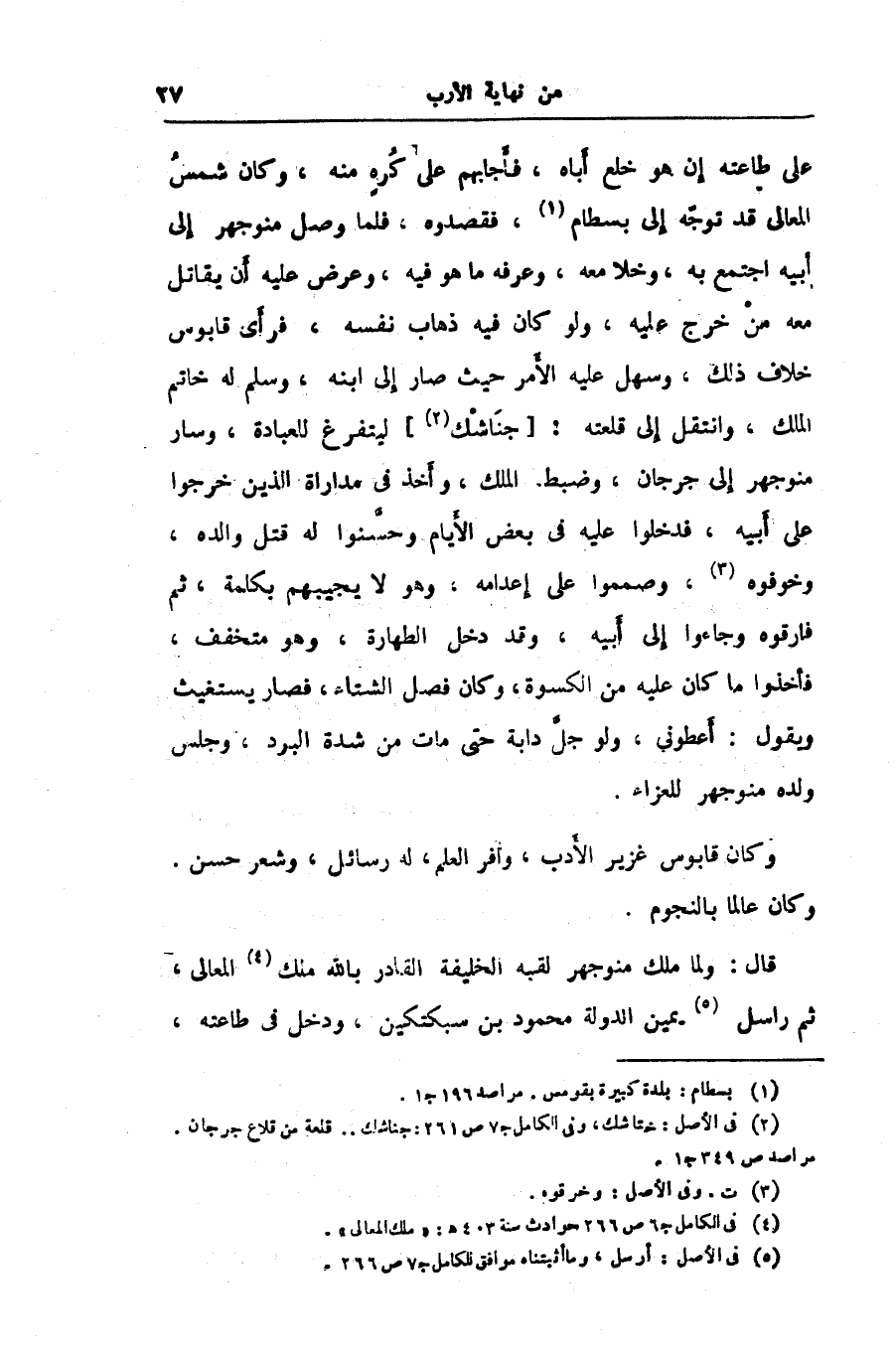 على طاعته إن هو خلع أباه، فأجابهم على كره منه، وكان شمس المعالى قد توجّه إلى بسطام «1» ، فقصدوه، فلما وصل منوجهر إلى أبيه اجتمع به، وخلا معه، وعرفه ما هو فيه، وعرض عليه أن يقاتل معه من خرج عليه، ولو كان فيه ذهاب نفسه، فرأى قابوس خلاف ذلك، وسهل عليه الأمر حيث صار إلى ابنه، وسلم له خاتم الملك، وانتقل إلى قلعته: [جناشك «2» ] ليتفرغ للعبادة، وسار منوجهر إلى جرجان، وضبط الملك، وأخذ في مداراة الذين خرجوا على أبيه، فدخلوا عليه في بعض الأيام وحسّنوا له قتل والده، وخوفوه «3» ، وصمموا على إعدامه، وهو لا يجيبهم بكلمة، ثم فارقوه وجاءوا إلى أبيه، وقد دخل الطهارة، وهو متخفف، فأخذوا ما كان عليه من الكسوة، وكان فصل الشتاء، فصار يستغيث ويقول: أعطونى، ولو جلّ دابة حتى مات من شدة البرد، وجلس ولده منوجهر للعزاء.