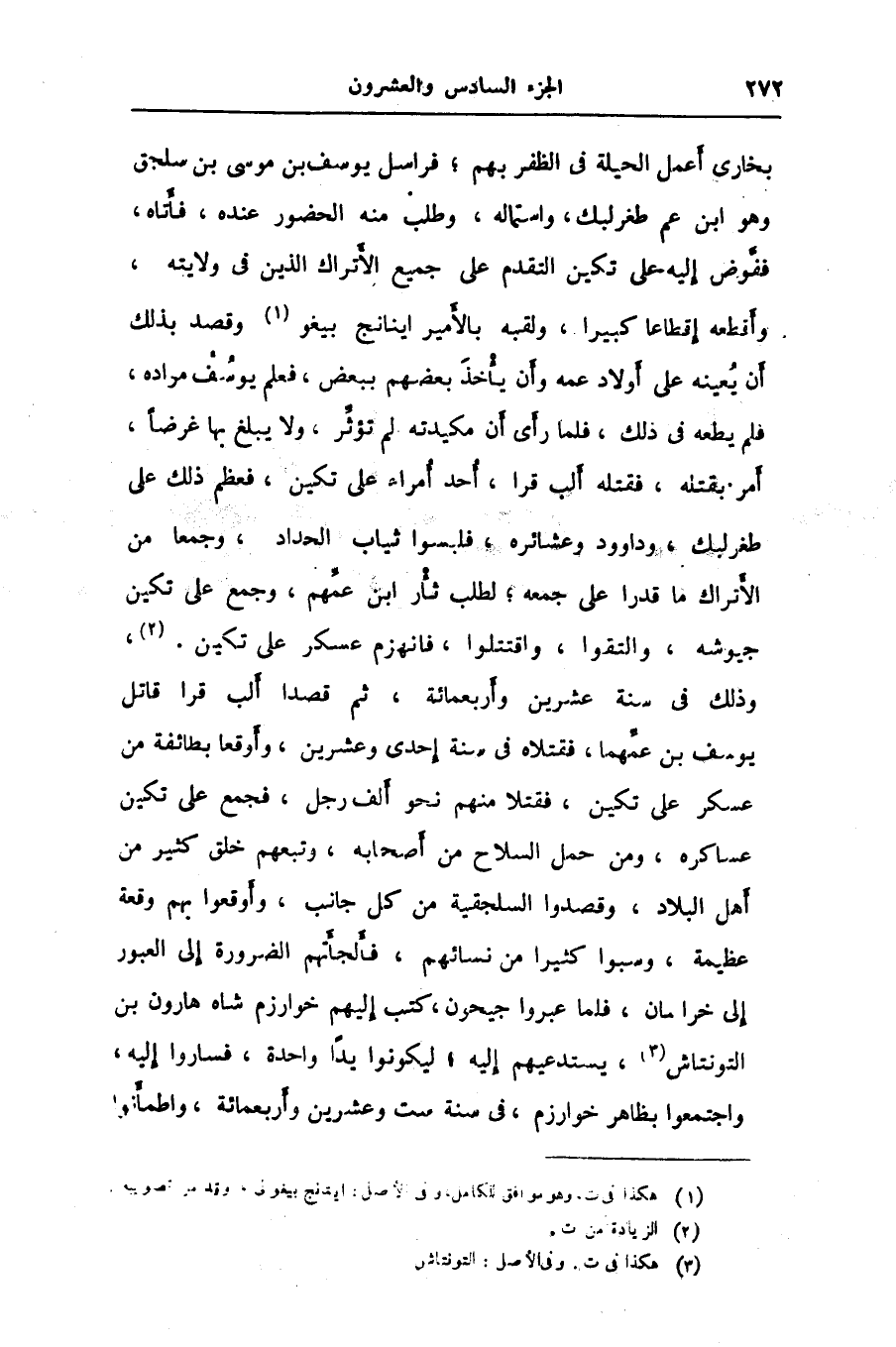وذلك في سنة عشرين وأربعمائة، ثم قصدا ألب قرا قاتل يوسف بن عمّهما، فقتلاه في سنة إحدى وعشرين، وأوقعا بطائفة من عسكر على تكين، فقتلا منهم نحو ألف رجل، فجمع على تكين عساكره، ومن حمل السلاح من أصحابه، وتبعهم خلق كثير من أهل البلاد، وقصدوا السلجقية من كل جانب، وأوقعوا بهم وقعة عظيمة، وسبوا كثيرا من نسائهم، فألجأتهم الضرورة إلى العبور إلى خراسان، فلما عبروا جيحون، كتب إليهم خوارزم شاه هارون بن التونتاش «3» ، يستدعيهم إليه؛ ليكونوا يدا واحدة، فساروا إليه، واجتمعوا بظاهر خوارزم، فى سنة ست وعشرين وأربعمائة، واطمأنوا