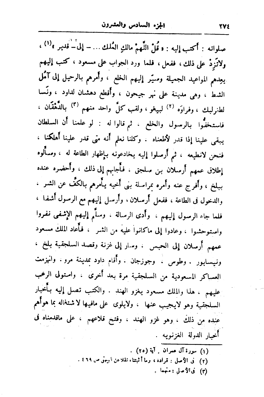 «1» ، ولا تزد على ذلك، ففعل، فلما ورد الجواب على مسعود، كتب إليهم يعدهم المواعيد الجميلة وسيّر إليهم الخلع، وأمرهم بالرحيل إلى آمل الشط، وهى مدينة على نهر جيحون، وأقطع دهشان لداود، ونسا لطغرلبك، وفراوه «2» لبيغو، ولقب كلّ واحد منهم «3» بالدّهقان، فاستخفّوا بالرسول والخلع، ثم قالوا له: لو علمنا أن السلطان يبقى علينا إذا قدر لأطعناه، وكلنا نعلم أنه متى قدر علينا أهلكنا، فنحن لا نطيعه، ثم أرسلوا إليه يخادعونه بإظهار الطاعة له، وسألوه إطلاق عمهم أرسلان بن سلجق، فأجابهم إلى ذلك، وأحضره عنده ببلخ، وأفرج عنه وأمره بمراسلة بنى أخيه يأمرهم بالكفّ عن الشر، والدخول في الطاعة، ففعل أرسلان، وأرسل إليهم مع الرسول أشفا، فلما جاء الرسول إليهم، وأدى الرسالة، وسلّم إليهم الإشفى نفروا واستوحشوا، وعادوا إلى ما كانوا عليه من الشر، فأعاد الملك مسعود عمهم أرسلان إلى الحبس، وسار إلى غزنة وقصد السلجقية بلخ، ونيسابور، وطوس، وجوزجان، وأقام داود بمدينة مرو، وانهزمت العساكر المسعودية من السلجقية مرة بعد أخرى، واستولى الرعب عليهم، هذا والملك مسعود يغزو الهند، والكتب تصل إليه بأخبار السلجقية وهو لا يجيب عنها، ولا يلوى على ما فيها لاشتغاله بما هو أهم عنده من ذلك، وهو غزو الهند، وفتح قلاعهم، على ما قدمناه في أخبار الدولة الغزنويه.