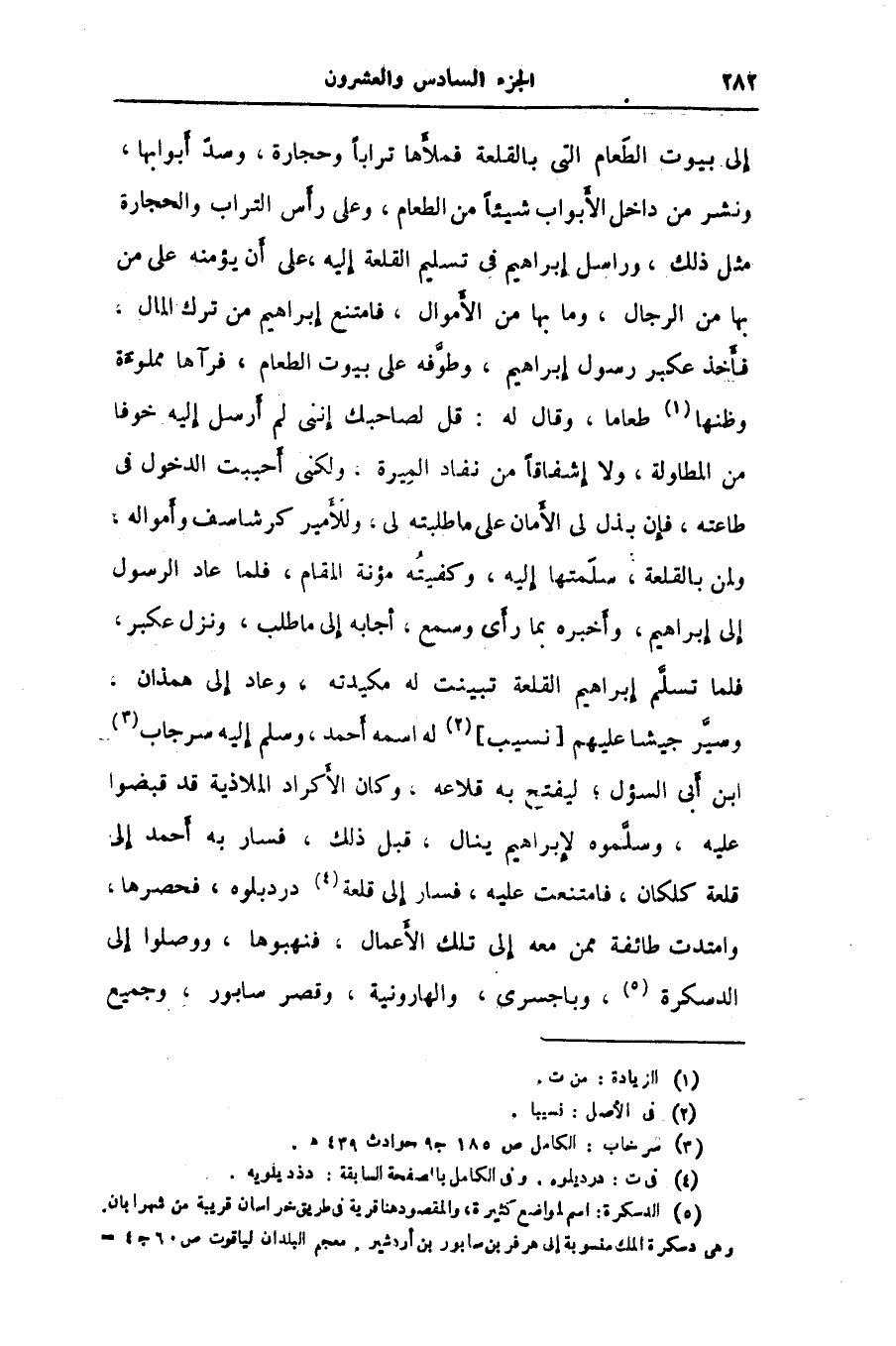 إلى بيوت الطعام التى بالقلعة فملأها ترابا وحجارة، وسدّ أبوابها، ونشر من داخل الأبواب شيئا من الطعام، وعلى رأس التراب والحجارة مثل ذلك، وراسل إبراهيم في تسليم القلعة إليه، على أن يؤمنه على من بها من الرجال، وما بها من الأموال، فامتنع إبراهيم من ترك المال، فأخذ عكبر رسول إبراهيم، وطوّفه على بيوت الطعام، فرآها مملوءة وظنها «1» طعاما، وقال له: قل لصاحبك إننى لم أرسل إليه خوفا من المطاولة، ولا إشفاقا من نفاد الميرة، ولكنى أحببت الدخول في طاعته، فإن بذل لى الأمان على ما طلبته لى، وللأمير كرشاسف وأمواله، ولمن بالقلعة، سلمتها إليه، وكفيته مؤنة المقام، فلما عاد الرسول إلى إبراهيم، وأخبره بما رأى وسمع، أجابه إلى ما طلب، ونزل عكبر، فلما تسلّم إبراهيم القلعة تبينت له مكيدته، وعاد إلى همذان، وسيّر جيشا عليهم [نسيب] «2» له اسمه أحمد، وسلم إليه سرجاب «3» ابن أبى السؤل؛ ليفتح به قلاعه، وكان الأكراد الملاذية قد قبضوا عليه، وسلّموه لإبراهيم ينال، قبل ذلك، فسار به أحمد إلى قلعة كلكان، فامتنعت عليه، فسار إلى قلعة «4» دردبلوه، فحصرها، وامتدت طائفة ممن معه إلى تلك الأعمال، فنهبوها، ووصلوا إلى الدسكرة «5» ، وباجسرى، والهارونية، وقصر سابور، وجميع
