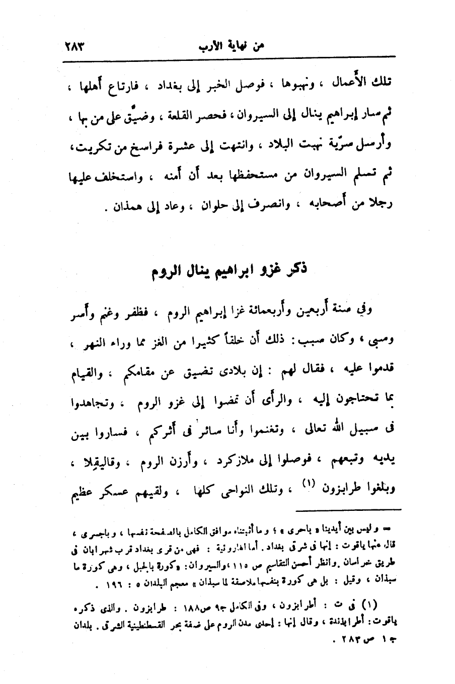 وفي سنة أربعين وأربعمائة غزا إبراهيم الروم، فظفر وغنم وأسر وسبى، وكان سبب: ذلك أن خلقا كثيرا من الغز مما وراء النهر، قدموا عليه، فقال لهم: إن بلادى تضيق عن مقامكم، والقيام بما تحتاجون إليه، والرأى أن تمضوا إلى غزو الروم، وتجاهدوا فى سبيل الله تعالى، وتغنموا وأنا سائر في أثركم، فساروا بين يديه وتبعهم، فوصلوا إلى ملازكرد، وأرزن الروم، وقاليقلا، وبلغوا طرابزون «1» ، وتلك النواحى كلها، ولقيهم عسكر عظيم