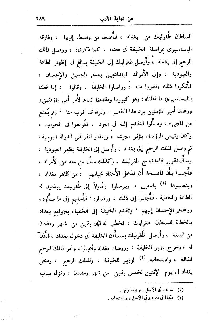 السلطان طغرلبك من بغداد، فأصعد من واسط إليها، وفارقه البساسيرى بمراسلة الخليفة في معناه، كما ذكرناه، ووصل الملك الرحيم إلى بغداد، وأرسل طغرلبك إلى الخليفة يبالغ في إظهار الطاعة والعبودية، وإلى الأتراك البغداديين يعدهم الجميل والإحسان، فأنكروا ذلك ونفروا منه، وراسلوا الخليفة، وقالوا: إنا فعلنا بالبساسيرى ما فعلناه، وهو كبيرنا ومقدمنا اتباعا لأمر أمير المؤمنين، ووعدنا أمير المؤمنين برد هذا الخصم، ونراه قد قرب منا، ولم يمنع من المجىء، وسألوا التقدم إليه في العود، فغولطوا في الجواب، وكان رئيس الرؤساء يؤثر مجيئه، ويختار انقراض الدولة البويهية، ثم وصل الملك الرحيم إلى بغداد، وأرسل إلى الخليفة يظهر العبودية، وسأل تقرير قاعدته مع طغرلبك، وكذلك سأل من معه من الأمراء، فأجيبوا بأن المصلحة أن تدخل الأجناد خيامهم، من ظاهر بغداد، وينصبوها «1» بالحريم، ويرسلوا رسولا إلى طغرلبك يبذلون له الطاعة والخطبة، فأجابوا إلى ذلك، وراسلوه، فأجابهم إلى ما سألوه، ووعدهم الإحسان إليهم، وتقدم الخليفة إلى الخطباء بجوامع بغداد بالخطبة للسلطان طغرلبك، فخطب له لثمان بقين من شهر رمضان من السنة، وأرسل طغرلبك يستأذن الخليفة في دخول بغداد، فأذن له، وخرج وزير الخليفة، وروساء بغداد وأعيانها، وأمر الملك الرحيم للقائه، واستحلفه «2» الوزير للخليفة، وللملك الرحيم، ودخل بغداد في يوم الإثنين لخمس بقين من شهر رمضان، ونزل بباب