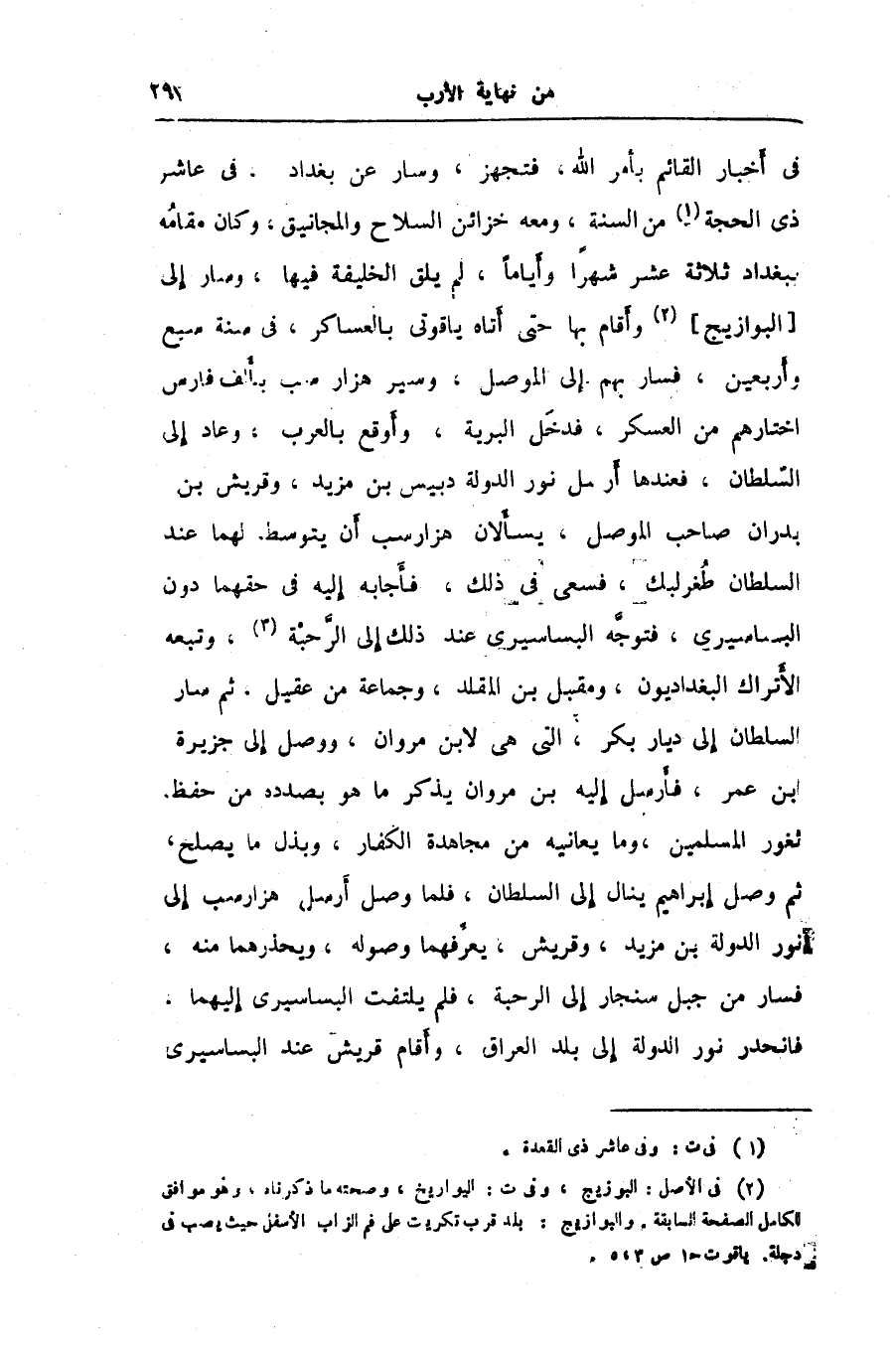 فى أخبار القائم بأمر الله، فتجهز، وسار عن بغداد، فى عاشر ذى الحجة «1» من السنة، ومعه خزائن السلاح والمجانيق، وكان مقامه ببغداد ثلاثة عشر شهرا وأياما، لم يلق الخليفة فيها، وسار إلى [البوازيج] «2» وأقام بها حتى أتاه ياقوتى بالعساكر، فى سنة سبع وأربعين، فسار بهم إلى الموصل، وسير هزار سب بألف فارس اختارهم من العسكر، فدخل البرية، وأوقع بالعرب، وعاد إلى السّلطان، فعندها أرسل نور الدولة دبيس بن مزيد، وقريش بن بدران صاحب الموصل، يسألان هزار سب أن يتوسط لهما عند السلطان طغرلبك، فسعى في ذلك، فأجابه إليه في حقهما دون البساسيرى، فتوجّه البساسيرى عند ذلك إلى الرّحبة، وتبعه الأتراك البغداديون، ومقبل بن المقلد، وجماعة من عقيل، ثم سار السلطان إلى ديار بكر، التى هى لابن مروان، ووصل إلى جزيرة ابن عمر، فأرسل إليه بن مروان يذكر ما هو بصدده من حفظ ثغور المسلمين، وما يعانيه من مجاهدة الكفار، وبذل ما يصلح، ثم وصل إبراهيم ينال إلى السلطان، فلما وصل أرسل هزار سب إلى نور الدولة بن مزيد، وقريش، يعرّفهما وصوله، ويحذرهما منه، فسار من جبل سنجار إلى الرحبة، فلم يلتفت البساسيرى إليهما، فانحدر نور الدولة إلى بلد العراق، وأقام قريش عند البساسيرى