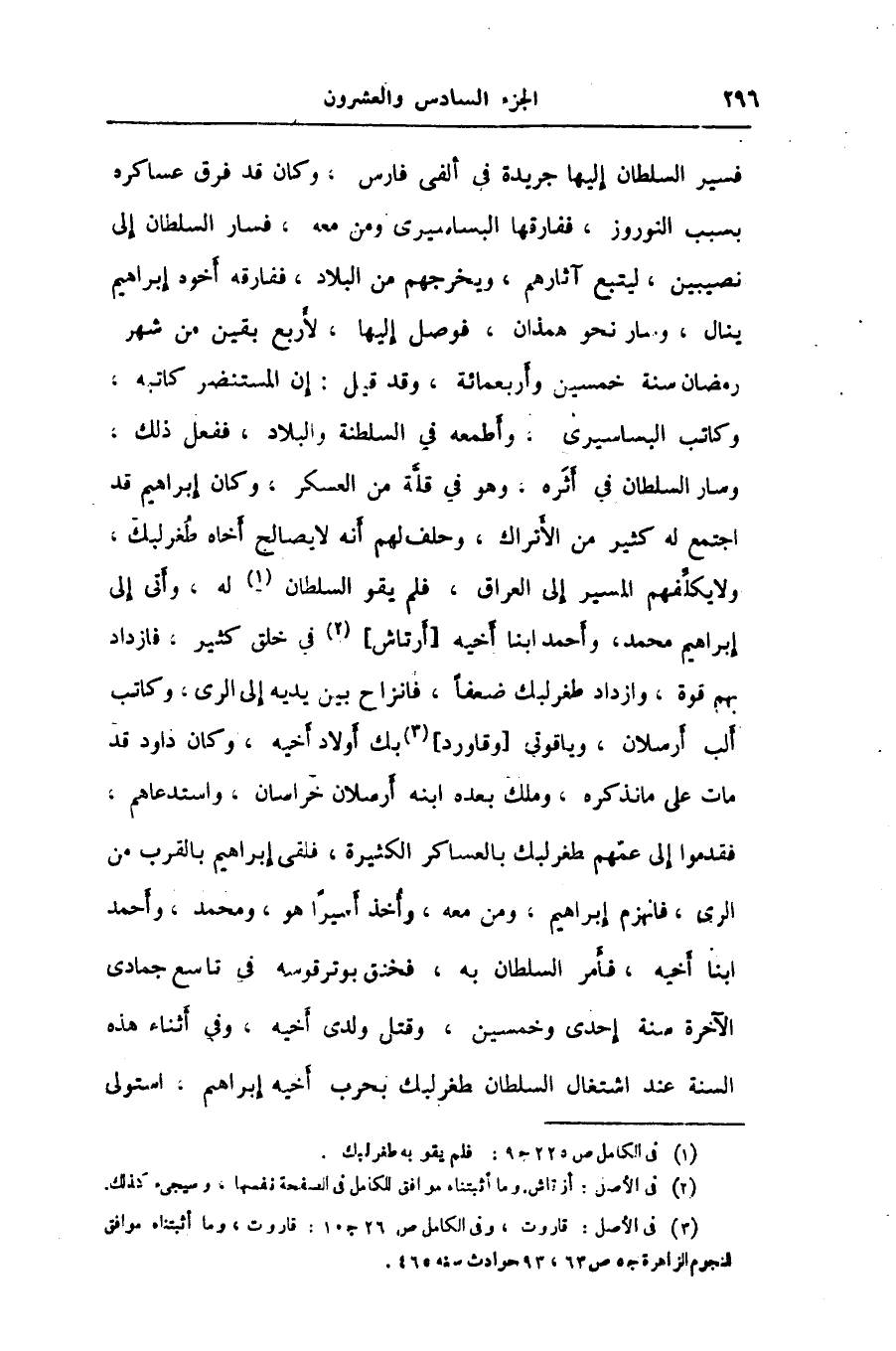 فسير السلطان إليها جريدة في ألفى فارس، وكان قد فرق عساكره بسبب النوروز، ففارقها البساسيرى ومن معه، فسار السلطان إلى نصيبين، ليتبع آثارهم، ويخرجهم من البلاد، ففارقه أخوه إبراهيم ينال، وسار نحو همذان، فوصل إليها، لأربع بقين من شهر رمضان سنة خمسين وأربعمائة، وقد قيل: إن المستنضر كاتبه، وكاتب البساسيرى، وأطمعه في السلطنة والبلاد، ففعل ذلك، وسار السلطان في أثره، وهو في قلّة من العسكر، وكان إبراهيم قد اجتمع له كثير من الأتراك، وحلف لهم أنه لا يصالح أخاه طغرلبك، ولا يكلّفهم المسير إلى العراق، فلم يقو السلطان «1» له، وأتى إلى إبراهيم محمد، وأحمد ابنا أخيه [أرتاش] «2» في خلق كثير، فازداد بهم قوة، وازداد طغرلبك ضعفا، فانزاح بين يديه إلى الرى، وكاتب ألب أرسلان، وياقوتى [وقاورد] «3» بك أولاد أخيه، وكان داود قد مات على ما نذكره، وملك بعده ابنه أرسلان خراسان، واستدعاهم، فقدموا إلى عمّهم طغرلبك بالعساكر الكثيرة، فلقى إبراهيم بالقرب من الرى، فانهزم إبراهيم، ومن معه، وأخذ أسيرا هو، ومحمد، وأحمد ابنا أخيه، فأمر السلطان به، فخنق بوترقوسه في تاسع جمادى الآخرة سنة إحدى وخمسين، وقتل ولدى أخيه، وفي أثناء هذه السنة عند اشتغال السلطان طغرلبك بحرب أخيه إبراهيم، استولى