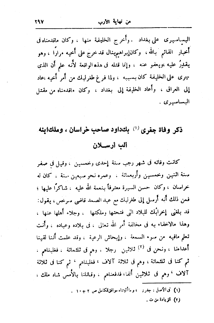 ذكر وفاة جغرى «1» بك داود صاحب خراسان، وملك ابنه ألب أرسلان