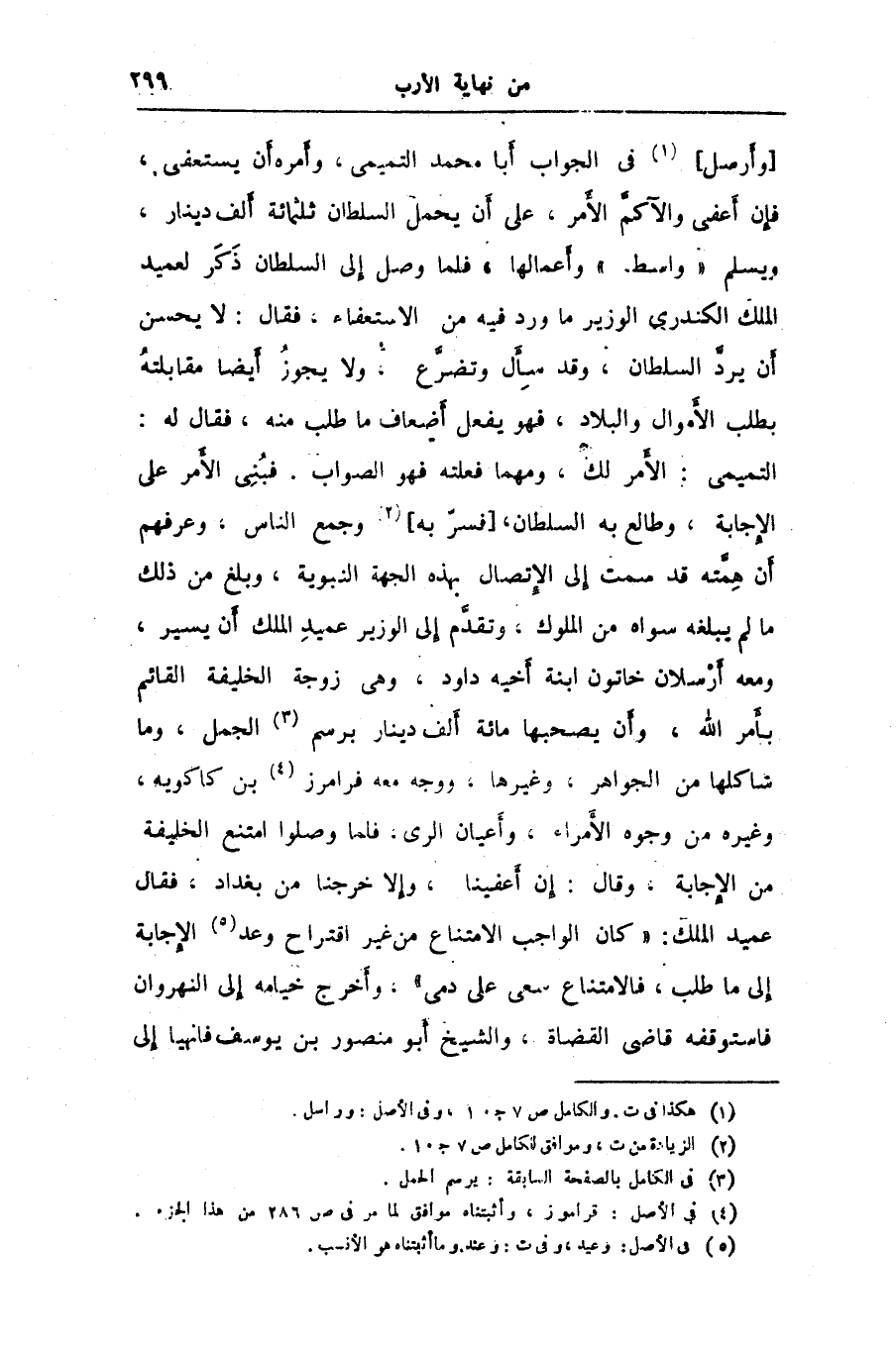 [وأرسل] «1» فى الجواب أبا محمد التميمى، وأمره أن يستعفى، فإن أعفى والآكمّ الأمر، على أن يحمل السلطان ثلاثمائة ألف دينار، ويسلم «واسط» وأعمالها، فلما وصل إلى السلطان ذكر لعميد الملك الكندرى الوزير ما ورد فيه من الاستعفاء، فقال: لا يحسن أن يردّ السلطان، وقد سأل وتضرّع، ولا يجوز أيضا مقابلته بطلب الأموال والبلاد، فهو يفعل أضعاف ما طلب منه، فقال له: