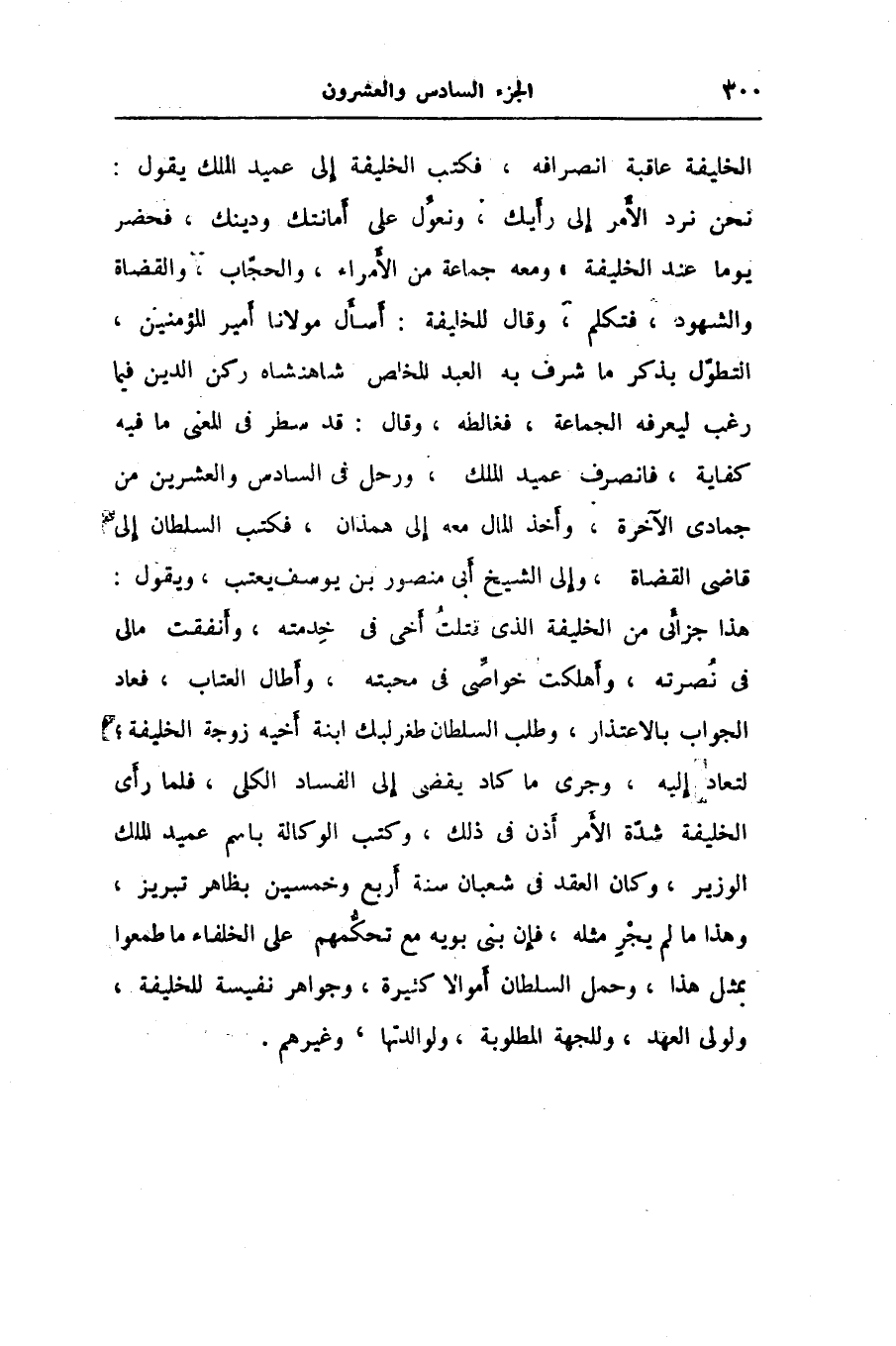 هذا جزائى من الخليفة الذى قتلت أخى في خدمته، وأنفقت مالى فى نصرته، وأهلكت خواصّى في محبته، وأطال العتاب، فعاد الجواب بالاعتذار، وطلب السلطان طغرلبك ابنة أخيه زوجة الخليفة؛ لتعاد إليه، وجرى ما كاد يقضى إلى الفساد الكلى، فلما رأى الخليفة شدّة الأمر أذن في ذلك، وكتب الوكالة باسم عميد الملك الوزير، وكان العقد في شعبان سنة أربع وخمسين بظاهر تبريز، وهذا ما لم يجر مثله، فإن بنى بويه مع تحكّمهم على الخلفاء ما طمعوا بمثل هذا، وحمل السلطان أموالا كثيرة، وجواهر نفيسة للخليفة، ولولى العهد، وللجهة المطلوبة، ولوالدتها، وغيرهم.