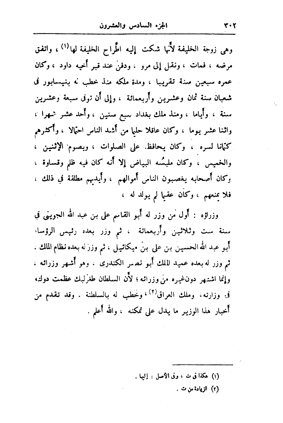 وهى زوجة الخليفة لأنها شكت إليه اطّراح الخليفة لها «1» ، واتفق مرضه، فمات، ونقل إلى مرو، ودفن عند قبر أخيه داود، وكان عمره سبعين سنة تقريبا، ومدة ملكه منذ خطب له بنيسابور في شعبان سنة ثمان وعشرين وأربعمائة، وإلى أن توفى سبعة وعشرين سنة، وأياما، ومنذ ملك بغداد سبع سنين، وأحد عشر شهرا، واثنا عشر يوما، وكان عاقلا حليما من أشد الناس احتمالا، وأكثرهم كتمانا لسره، وكان يحافظ على الصلوات، ويصوم الإثنين، والخميس، وكان ملبسه البياض إلا أنه كان فيه ظلم وقساوة، وكان أصحابه يغصبون الناس أموالهم، وأيديهم مطلقة في ذلك، فلا يمنعهم، وكان عقيما لم يولد له، وزراؤه: أول من وزر له أبو القاسم على بن عبد الله الجوينى في سنة ست وثلاثين وأربعمائة، ثم وزر بعده رئيس الرؤساء أبو عبد الله الحسين بن على بن ميكائيل، ثم وزر له بعده نظام الملك، ثم وزر له بعده عميد الملك أبو نصر الكندرى، وهو أشهر وزرائه، وإنما اشتهر دون غيره من وزرائه؛ لأن السلطان طغرلبك عظمت دولته فى وزارته، وملك العراق «2» ، وخطب له بالسلطنة. وقد تقدم من أخبار هذا الوزير ما يدل على تمكنه، والله أعلم.