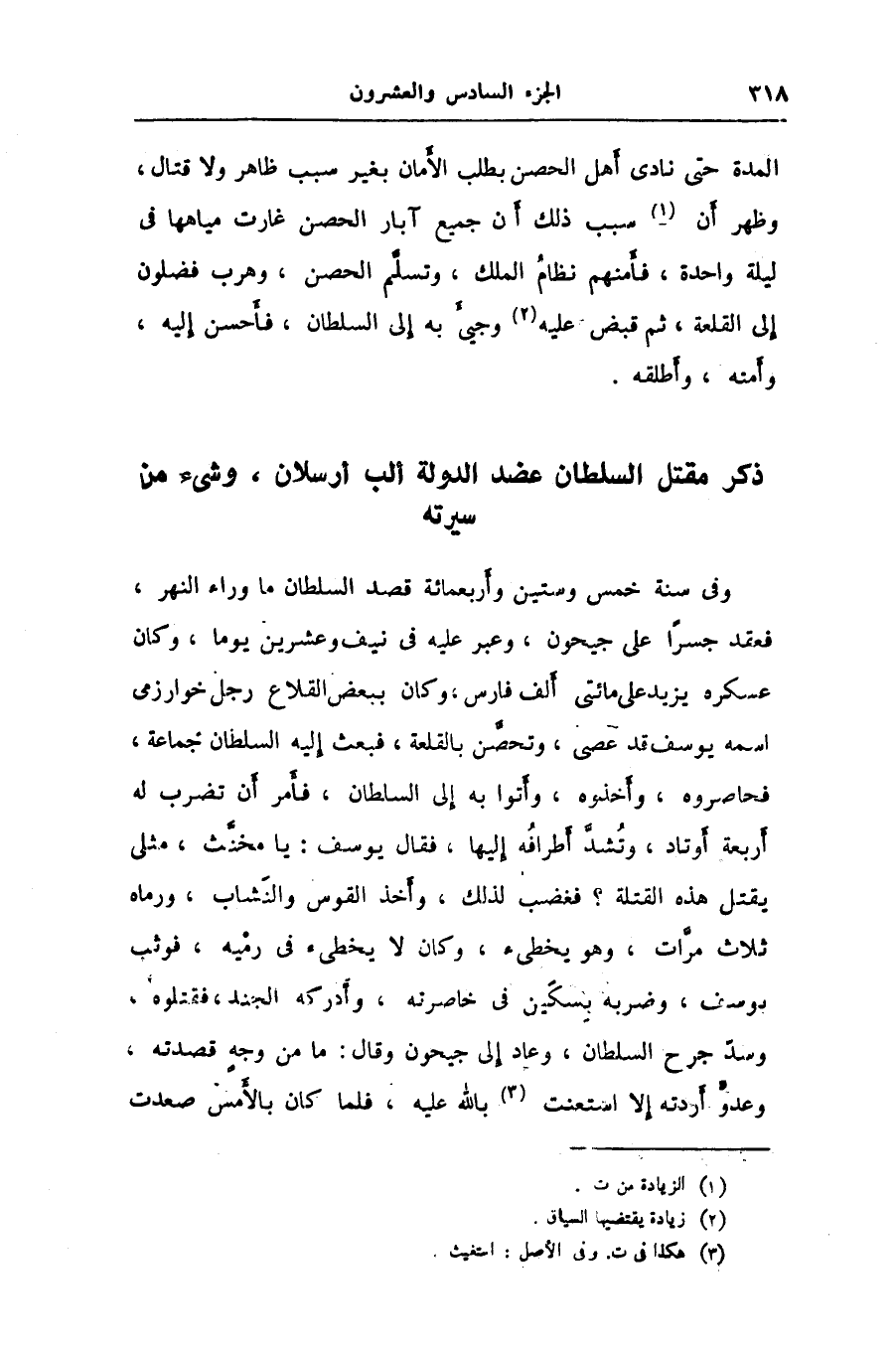 وفي سنة خمس وستين وأربعمائة قصد السلطان ما وراء النهر، فعقد جسرا على جيحون، وعبر عليه في نيف وعشرين يوما، وكان عسكره يزيد على مائتى ألف فارس، وكان ببعض القلاع رجل خوارزمى اسمه يوسف قد عصى، وتحصّن بالقلعة، فبعث إليه السلطان جماعة، فحاصروه، وأخذوه، وأتوا به إلى السلطان، فأمر أن تضرب له أربعة أوتاد، وتشدّ أطرافه إليها، فقال يوسف: يا مخنّث، مثلى يقتل هذه القتلة؟ فغضب لذلك، وأخذ القوس والنشاب، ورماه ثلاث مرّات، وهو يخطىء، وكان لا يخطىء في رميه، فوثب يوسف، وضربه بسكين في خاصرته، وأدركه الجند، فقتلوه، وسدّ جرح السلطان، وعاد إلى جيحون وقال: ما من وجه قصدته، وعدوّ أردته إلا استعنت «3» بالله عليه، فلما كان بالأمس صعدت