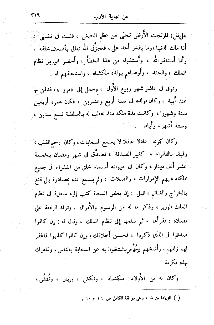 وكان كريما عادلا عاقلا لا يسمع السعايات، وكان رحيم القلب، رفيقا بالفقراء، كثير الصدقة، تصدّق في شهر رمضان بخمسة عشر ألف دينار، وكان في ديوانه أسماء خلق من الفقراء في جميع مملكته عليهم الإدرارات، والصلات، ولم يسمع عنه بمصادرة بل قنع بالخراج والغنائم، قيل: إن بعض السعاة كتب إليه سعاية في نظام الملك الوزير، وذكر ما له من الرسوم والأموال، وترك الرقعة على مصلاه، فقرأها، ثم سلمها إلى نظام الملك، وقال له: إن كانوا صدقوا في الذى ذكروا، فحسن أخلاقك، وإن كانوا كذبوا فاغفر لهم زلتهم، وأشغلهم بمهمّ يشتغلون به عن السعاية بالناس، وناهيك بهذه مكرمة. «1»