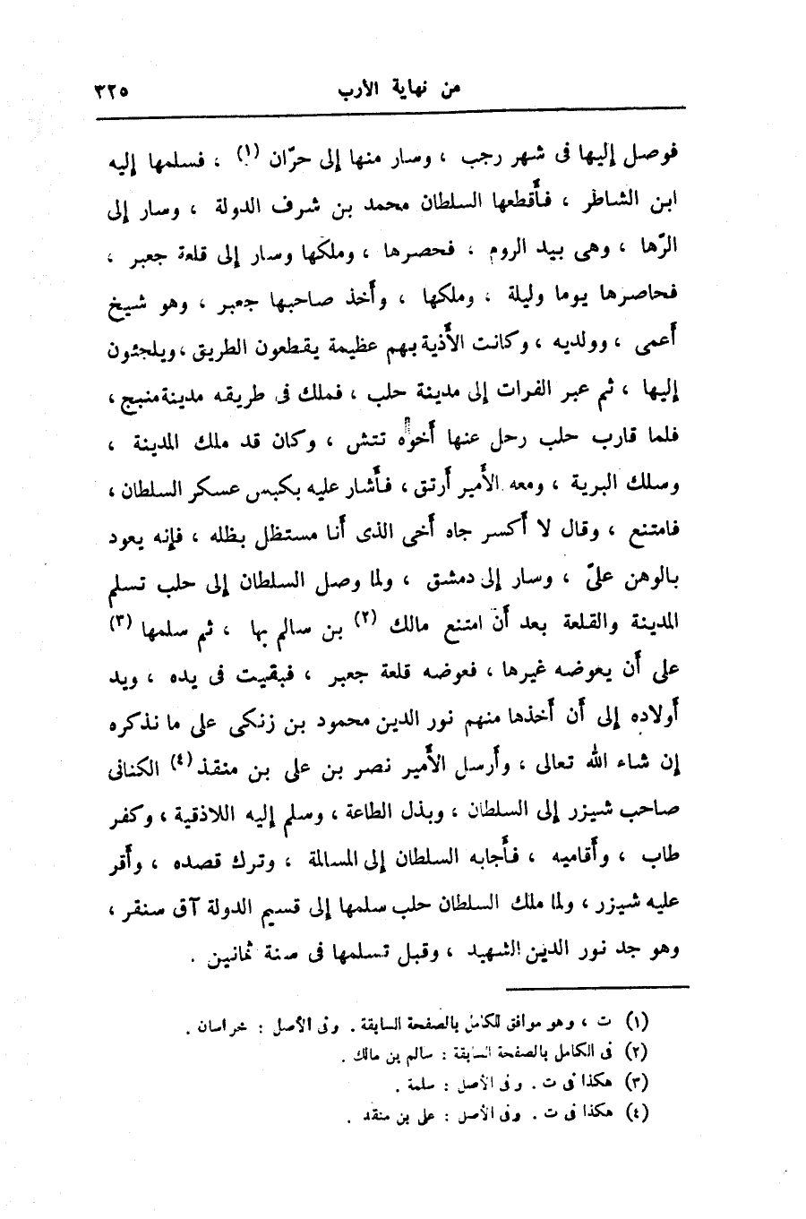 فوصل إليها في شهر رجب، وسار منها إلى حرّان «1» ، فسلمها إليه ابن الشاطر، فأقطعها السلطان محمد بن شرف الدولة، وسار إلى الرّها، وهى بيد الروم، فحصرها، وملكها وسار إلى قلعة جعبر، فحاصرها يوما وليلة، وملكها، وأخذ صاحبها جعبر، وهو شيخ أعمى، وولديه، وكانت الأذية بهم عظيمة يقطعون الطريق، ويلجئون إليها، ثم عبر الفرات إلى مدينة حلب، فملك في طريقه مدينة منبج، فلما قارب حلب رحل عنها أخوه تتش، وكان قد ملك المدينة، وسلك البرية، ومعه الأمير أرتق، فأشار عليه بكبس عسكر السلطان، فامتنع، وقال لا أكسر جاه أخى الذى أنا مستظل بظله، فإنه يعود بالوهن علىّ، وسار إلى دمشق، ولما وصل السلطان إلى حلب تسلم المدينة والقلعة بعد أن امتنع مالك «2» بن سالم بها، ثم سلمها «3» على أن يعوضه غيرها، فعوضه قلعة جعبر، فبقيت في يده، ويد أولاده إلى أن أخذها منهم نور الدين محمود بن زنكى على ما نذكره إن شاء الله تعالى، وأرسل الأمير نصر بن على بن منقذ «4» الكنانى صاحب شيزر إلى السلطان، وبذل الطاعة، وسلم إليه اللاذقية، وكفر طاب، وأقاميه، فأجابه السلطان إلى المسالمة، وترك قصده، وأقر عليه شيزر، ولما ملك السلطان حلب سلمها إلى قسيم الدولة آق سنقر، وهو جد نور الدين الشهيد، وقبل تسلمها في سنة ثمانين.