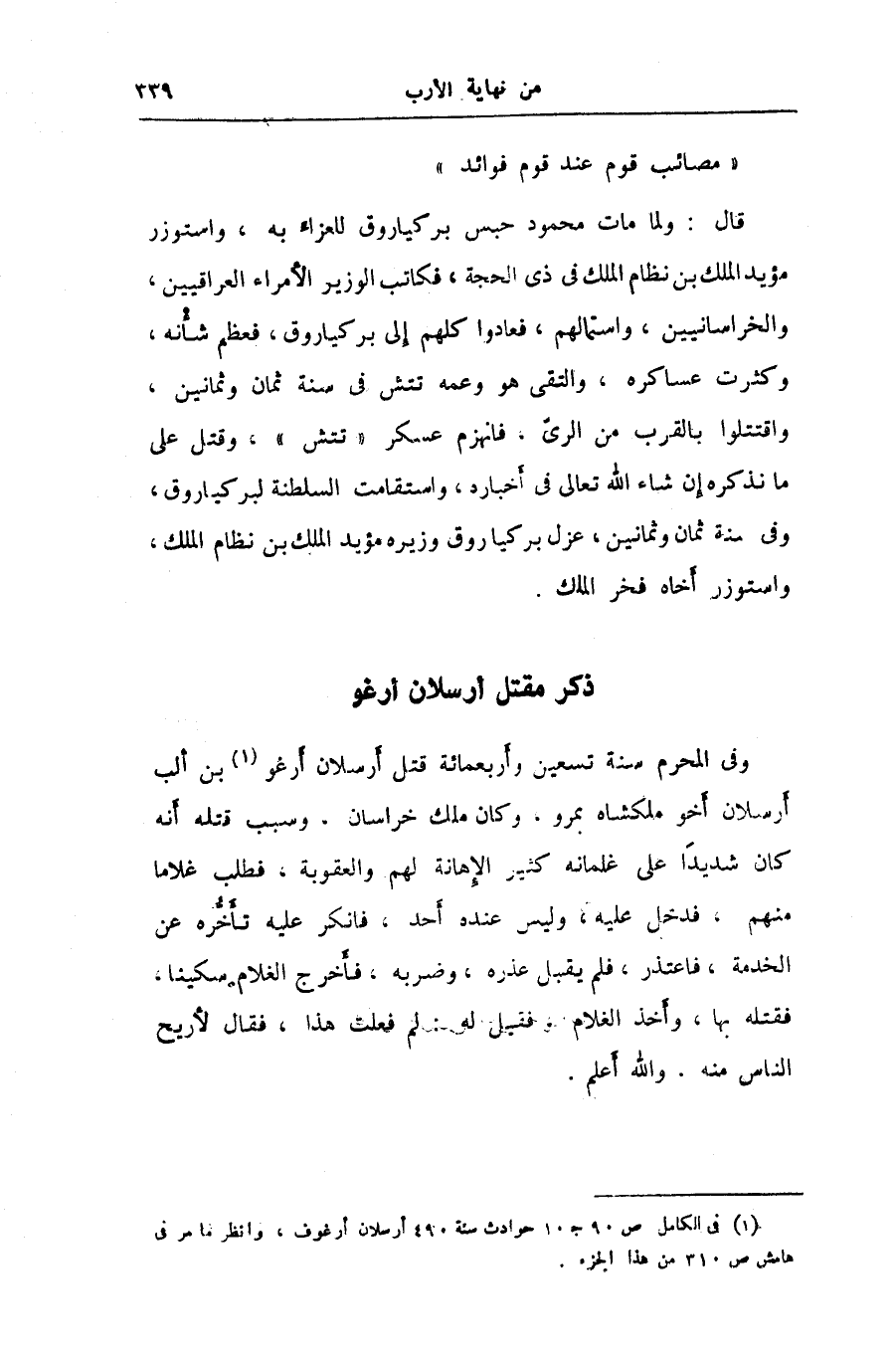 وفي المحرم سنة تسعين وأربعمائة قتل أرسلان أرغو «1» بن ألب أرسلان أخو ملكشاه بمرو، وكان ملك خراسان، وسبب قتله أنه كان شديدا على غلمانه كثير الإهانة لهم والعقوبة، فطلب غلاما منهم، فدخل عليه، وليس عنده أحد، فانكر عليه تأخّره عن الخدمة، فاعتذر، فلم يقبل عذره، وضربه، فأخرج الغلام سكينا، فقتله بها، وأخذ الغلام، فقيل له: لم فعلت هذا، فقال لأريح الناس منه. والله أعلم.