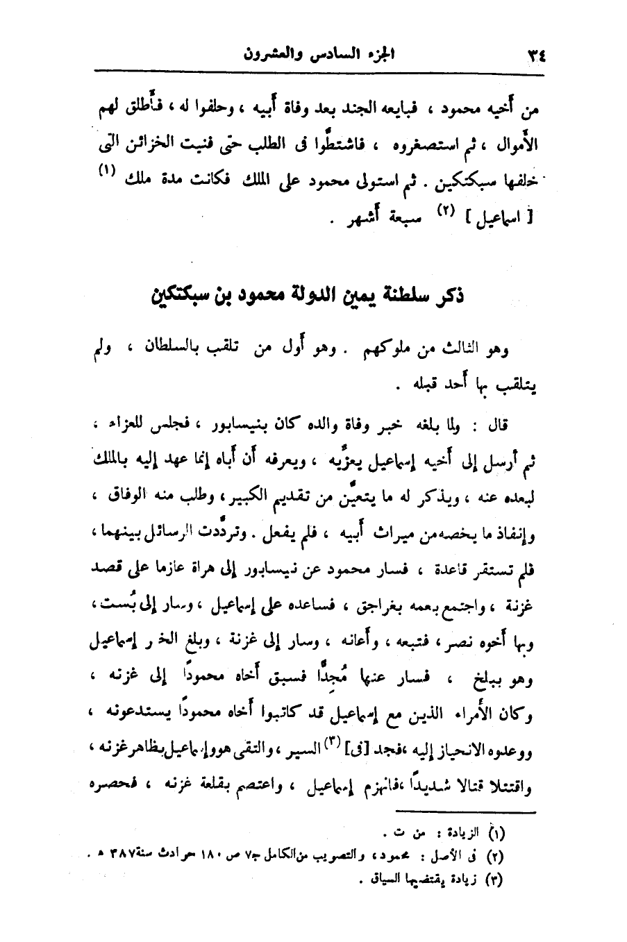 قال: ولما بلغه خبر وفاة والده كان بنيسابور، فجلس للعزاء، ثم أرسل إلى أخيه إسماعيل يعزّيه، ويعرفه أن أباه إنما عهد إليه بالملك لبعده عنه، ويذكر له ما يتعيّن من تقديم الكبير، وطلب منه الوفاق، وإنفاذ ما يخصه من ميراث أبيه، فلم يفعل. وتردّدت الرسائل بينهما، فلم تستقر قاعدة، فسار محمود عن نيسابور إلى هراة عازما على قصد غزنة، واجتمع بعمه بغراجق، فساعده على إسماعيل، وسار إلى بست، وبها أخوه نصر، فتبعه، وأعانه، وسار إلى غزنة، وبلغ الخبر إسماعيل وهو ببلخ، فسار عنها مجدّا فسبق أخاه محمودا إلى غزنه، وكان الأمراء الذين مع إسماعيل قد كاتبوا أخاه محمودا يستدعونه، ووعدوه الانحياز إليه، فجد [فى] «3» السير، والتقى هو وإسماعيل بظاهر غزنه، واقتتلا قتالا شديدا، فانهزم إسماعيل، واعتصم بقلعة غزنه، فحصره