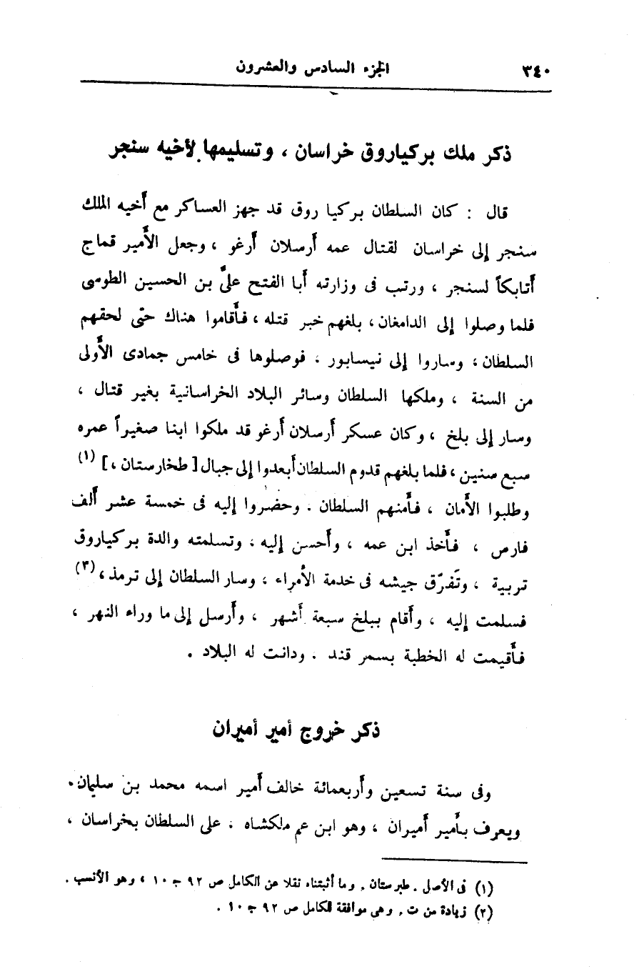 قال: كان السلطان بركياروق قد جهز العساكر مع أخيه الملك سنجر إلى خراسان لقتال عمه أرسلان أرغو، وجعل الأمير قماج أتابكا لسنجر، ورتب في وزارته أبا الفتح علىّ بن الحسين الطوسى فلما وصلوا إلى الدامغان، بلغهم خبر قتله، فأقاموا هناك حتى لحقهم السلطان، وساروا إلى نيسابور، فوصلوها في خامس جمادى الأولى من السنة، وملكها السلطان وسائر البلاد الخراسانية بغير قتال، وسار إلى بلخ، وكان عسكر أرسلان أرغو قد ملكوا ابنا صغيرا عمره سبع سنين، فلما بلغهم قدوم السلطان أبعدوا إلى جبال [طخارستان،] «1» وطلبوا الأمان، فأمنهم السلطان، وحضروا إليه في خمسة عشر ألف فارس، فأخذ ابن عمه، وأحسن إليه، وتسلمته والدة بركياروق تربية، وتفرّق جيشه في خدمة الأمراء، وسار السلطان إلى ترمذ، «2» فسلمت إليه، وأقام ببلخ سبعة أشهر، وأرسل إلى ما وراء النهر، فأقيمت له الخطبة بسمرقند، ودانت له البلاد.