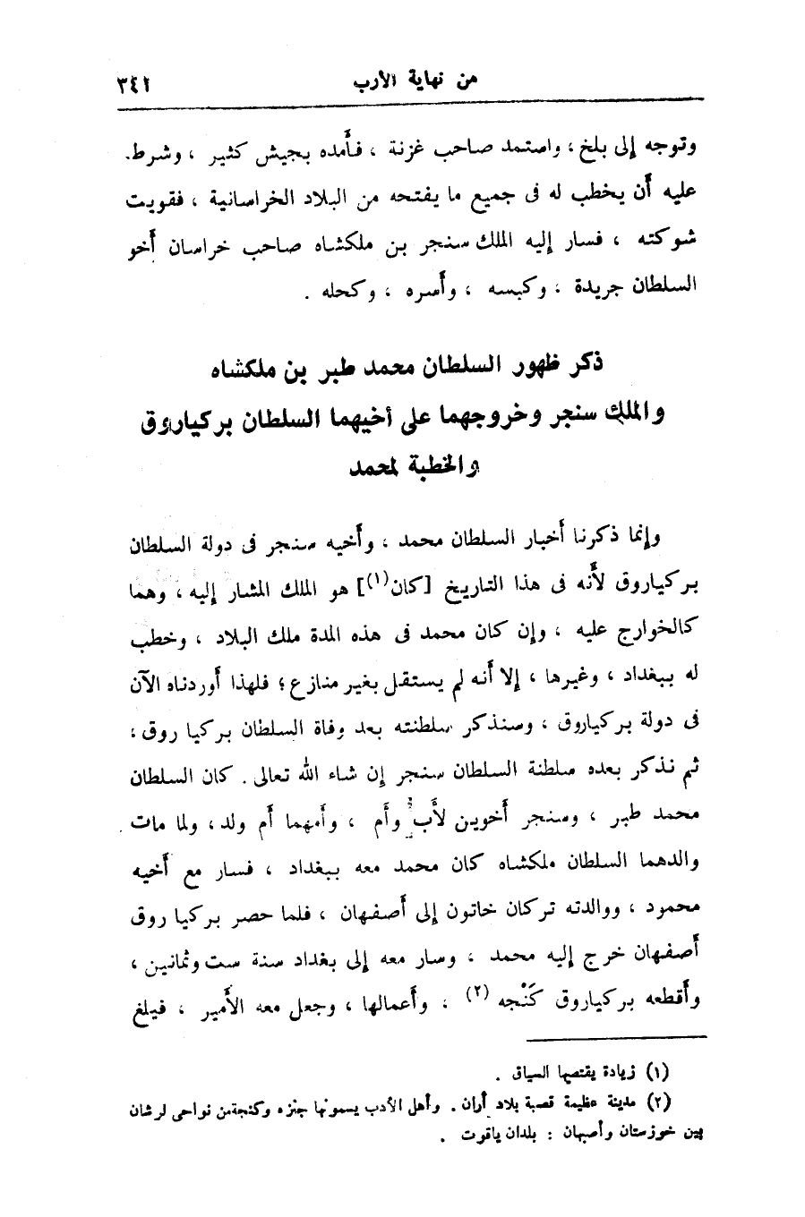وإنما ذكرنا أخبار السلطان محمد، وأخيه سنجر في دولة السلطان بركياروق لأنه في هذا التاريخ [كان «1» ] هو الملك المشار إليه، وهما كالخوارج عليه، وإن كان محمد في هذه المدة ملك البلاد، وخطب له ببغداد، وغيرها، إلا أنه لم يستقل بغير منازع؛ فلهذا أوردناه الآن فى دولة بركياروق، وسنذكر سلطنته بعد وفاة السلطان بركياروق، ثم نذكر بعده سلطنة السلطان سنجر إن شاء الله تعالى. كان السلطان محمد طبر، وسنجر أخوين لأب وأم، وأمهما أم ولد، ولما مات والدهما السلطان ملكشاه كان محمد معه ببغداد، فسار مع أخيه محمود، ووالدته تركان خاتون إلى أصفهان، فلما حصر بركياروق أصفهان خرج إليه محمد، وسار معه إلى بغداد سنة ست وثمانين، وأقطعه بركياروق كنجه «2» ، وأعمالها، وجعل معه الأمير، فيلغ