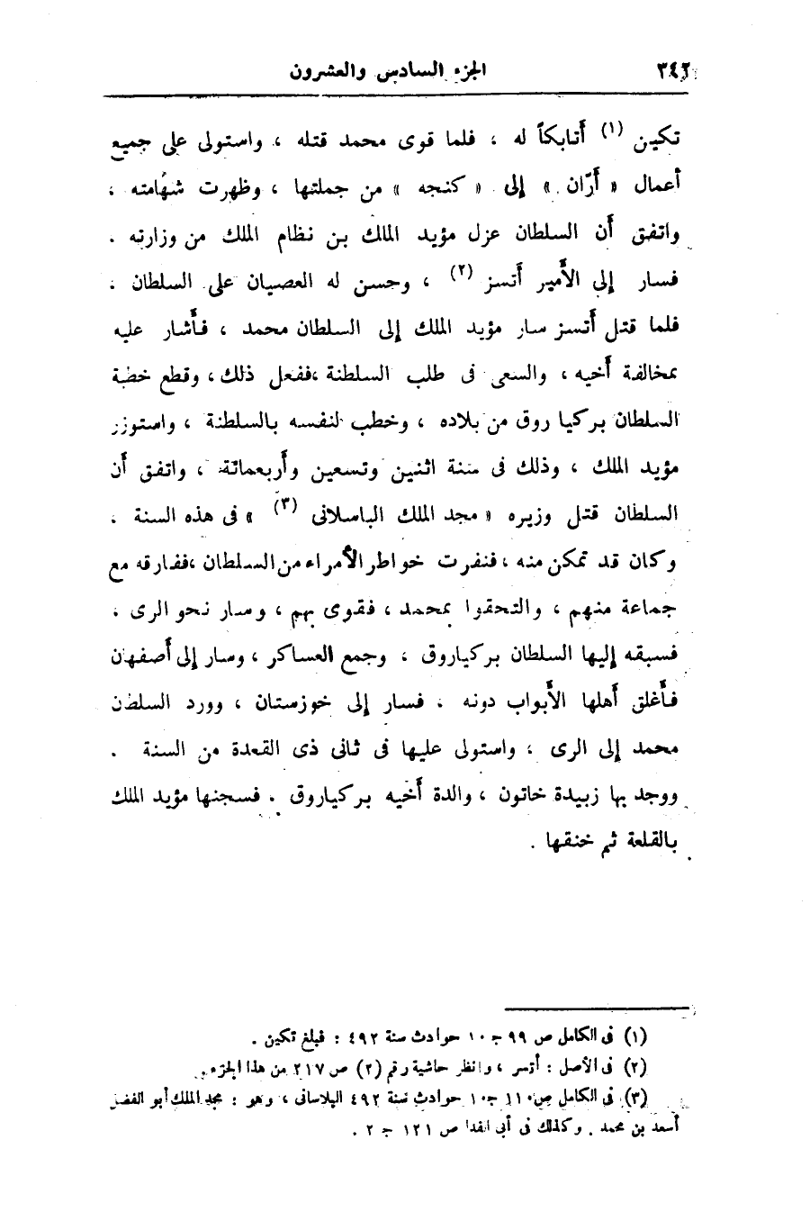 تكين «1» أتابكا له، فلما قوى محمد قتله، واستولى على جميع أعمال «أرّان» إلى «كنجه» من جملتها، وظهرت شهامته، واتفق أن السلطان عزل مؤيد الملك بن نظام الملك من وزارته، فسار إلى الأمير أتسز «2» ، وحسن له العصيان على السلطان، فلما قتل أتسز سار مؤيد الملك إلى السلطان محمد، فأشار عليه بمخالفة أخيه، والسعى في طلب السلطنة، ففعل ذلك، وقطع خطبة السلطان بركياروق من بلاده، وخطب لنفسه بالسلطنة، واستوزر مؤيد الملك، وذلك في سنة اثنين وتسعين وأربعمائة، واتفق أن السلطان قتل وزيره «مجد الملك الباسلانى «3» » فى هذه السنة، وكان قد تمكن منه، فنفرت خواطر الأمراء من السلطان، ففارقه مع جماعة منهم، والتحقوا بمحمد، فقوى بهم، وسار نحو الرى، فسبقه إليها السلطان بركياروق، وجمع العساكر، وسار إلى أصفهان فأغلق أهلها الأبواب دونه، فسار إلى خوزستان، وورد السلطان محمد إلى الرى، واستولى عليها في ثانى ذى القعدة من السنة.