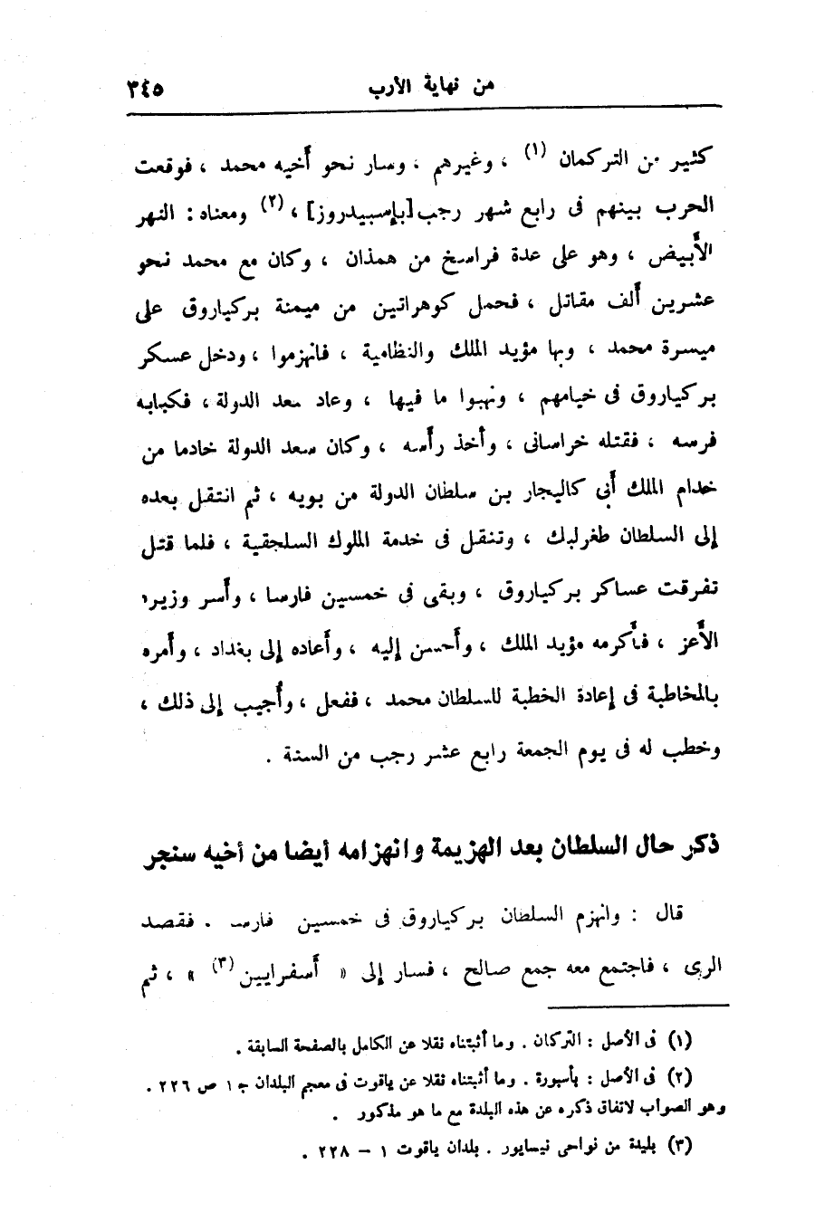 كثير من التركمان «1» ، وغيرهم، وسار نحو أخيه محمد، فوقعت الحرب بينهم في رابع شهر رجب [بإسبيدروز] ، «2» ومعناه: النهر الأبيض، وهو على عدة فراسخ من همذان، وكان مع محمد نحو عشرين ألف مقاتل، فحمل كوهراتين من ميمنة بركياروق على ميسرة محمد، وبها مؤيد الملك والنظامية، فانهزموا، ودخل عسكر بركياروق في خيامهم، ونهبوا ما فيها، وعاد سعد الدولة، فكبابه فرسه، فقتله خراسانى، وأخذ رأسه، وكان سعد الدولة خادما من خدام الملك أبى كاليجار بن سلطان الدولة من بويه، ثم انتقل بعده إلى السلطان طغرلبك، وتنقل في خدمة الملوك السلجقية، فلما قتل تفرقت عساكر بركياروق، وبقى في خمسين فارسا، وأسر وزيره الأعز، فأكرمه مؤيد الملك، وأحسن إليه، وأعاده إلى بغداد، وأمره بالمخاطبة في إعادة الخطبة للسلطان محمد، ففعل، وأجيب إلى ذلك، وخطب له في يوم الجمعة رابع عشر رجب من السنة.