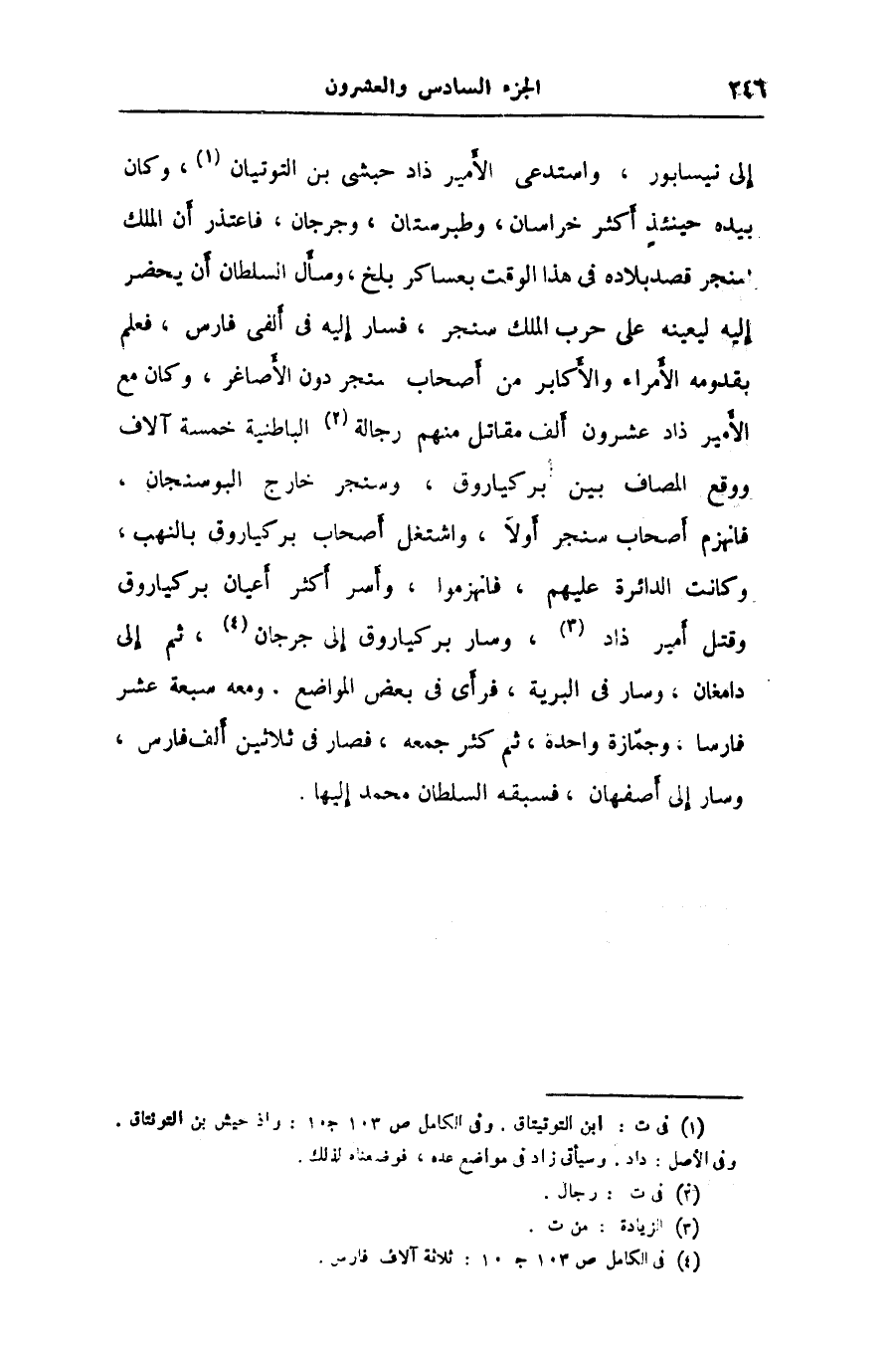إلى نيسابور، واستدعى الأمير ذاد حبشى بن التوتيان «1» ، وكان بيده حينئذ أكثر خراسان، وطبرستان، وجرجان، فاعتذر أن الملك سنجر قصد بلاده في هذا الوقت بعساكر بلخ، وسأل السلطان أن يحضر إليه ليعينه على حرب الملك سنجر، فسار إليه في ألفى فارس، فعلم بقدومه الأمراء والأكابر من أصحاب سنجر دون الأصاغر، وكان مع الأمير ذاد عشرون ألف مقاتل منهم رجالة «2» الباطنية خمسة آلاف ووقع المصاف بين بركياروق، وسنجر خارج البوسنجان، فانهزم أصحاب سنجر أولا، واشتغل أصحاب بركياروق بالنهب، وكانت الدائرة عليهم، فانهزموا، وأسر أكثر أعيان بركياروق وقتل أمير ذاد «3» ، وسار بركياروق إلى جرجان «4» ، ثم إلى دامغان، وسار في البرية، فرأى في بعض المواضع، ومعه سبعة عشر فارسا، وجمّازة واحدة، ثم كثر جمعه، فصار في ثلاثين ألف فارس، وسار إلى أصفهان، فسبقه السلطان محمد إليها.