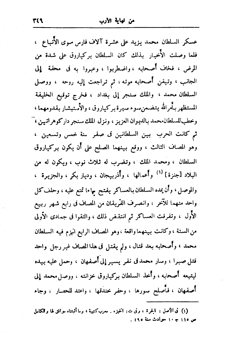 عسكر السلطان محمد يزيد على عشرة آلاف فارس سوى الأتباع، فلما وصلت الأخبار بذلك كان السلطان بركياروق على شدة من المرض، فخاف أصحابه، واضطربوا، وعبروا به في محفة إلى الجانب، وتيقن أصحابه موته، ثم تراجعت إليه روحه، ووصل السلطان محمد، والملك سنجر إلى بغداد، فخرج توقيع الخليفة المستظهر بأمر الله يتضمن سوء سيرة بركياروق، والأستبشار بقدومهما، وخطب للسلطان محمد بالديوان العزيز، ونزل الملك سنجر دار كوهراتين، ثم كانت الحرب بين السلطانين في صفر سنة خمس وتسعين، وهو المصاف الثالث، ووقع بينهما الصلح على أن يكون بركياروق السلطان، ومحمد الملك، وتضرب له ثلاث نوب، ويكون له من البلاد [جنزة] «1» وأعمالها، وأذربيجان، وديار بكر، والجزيرة، والموصل، وأن يمده السلطان بالعساكر يفتح بها ما تمنع عليه، وحلف كل واحد منهما للآخر، وانصرف الفريقان من المصاف في رابع شهر ربيع الأول، وتفرقت العساكر ثم انتقض ذلك، والتقوا في جمادى الأولى من السنة، وكانت بينهما واقعة، وهو المصاف الرابع انهزم فيه السلطان محمد، وأصحابه بعد قتال، ولم يقتل في هذا المصاف غير رجل واحد قتل صبرا، وسار محمد في نفر يسير إلى أصفهان، وحمل عليه بيده ليتبعه أصحابه، وأخذ السلطان بركياروق خزانته، ووصل محمد إلى أصفهان، فأصلح سورها، وحفر خندقها، واعتد للحصار، وجاء
