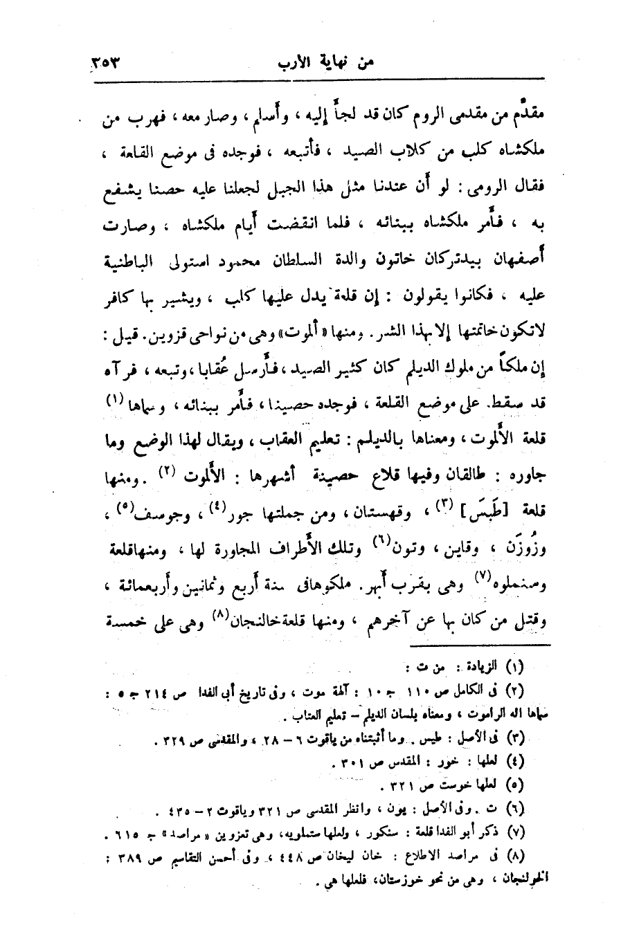 إن ملكا من ملوك الديلم كان كثير الصيد، فأرسل عقابا، وتبعه، فرآه قد سقط على موضع القلعة، فوجده حصينا، فأمر ببنائه، وسماها «1» قلعة الألموت، ومعناها بالديلم: تعليم العقاب، ويقال لهذا الوضع وما جاوره: طالقان وفيها قلاع حصينة أشهرها: الألموت «2» . ومنها قلعة [طبس] «3» ، وقهستان، ومن جملتها جور «4» ، وجوسف «5» ، وزوزن، وقاين، وتون «6» وتلك الأطراف المجاورة لها، ومنها قلعة وسنملوه «7» وهى بقرب أبهر. ملكوها في سنة أربع وثمانين وأربعمائة، وقتل من كان بها عن آخرهم، ومنها قلعة خالنجان «8» وهى على خمسة