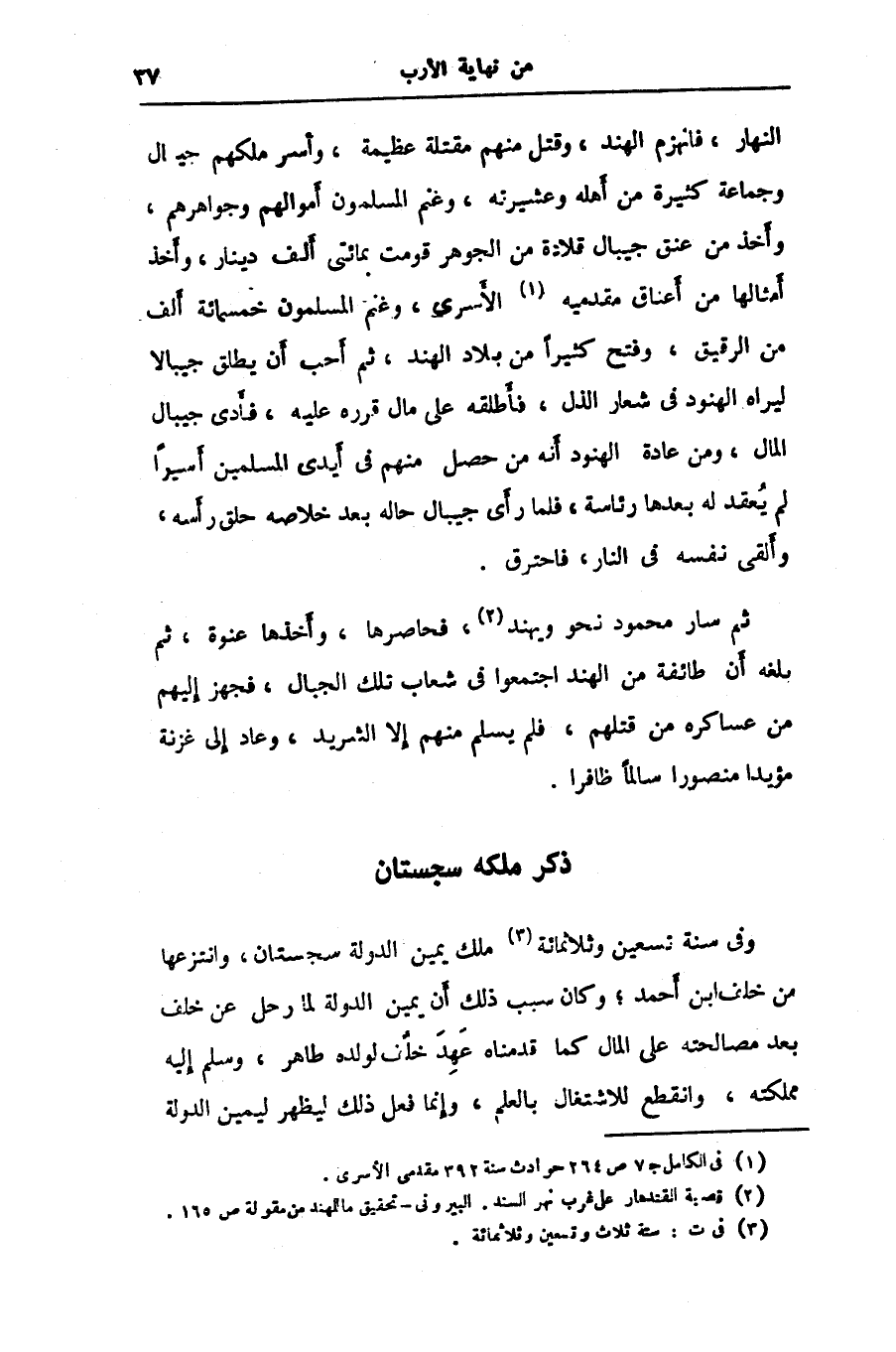 النهار، فانهزم الهند، وقتل منهم مقتلة عظيمة، وأسر ملكهم جيال وجماعة كثيرة من أهله وعشيرته، وغنم المسلمون أموالهم وجواهرهم، وأخذ من عنق جيبال قلادة من الجوهر قومت بمائتى ألف دينار، وأخذ أمثالها من أعناق مقدميه «1» الأسرى، وغنم المسلمون خمسمائة ألف من الرقيق، وفتح كثيرا من بلاد الهند، ثم أحب أن يطلق جيبالا ليراه الهنود في شعار الذل، فأطلقه على مال قرره عليه، فأدى جيبال المال، ومن عادة الهنود أنه من حصل منهم في أيدى المسلمين أسيرا لم يعقد له بعدها رئاسة، فلما رأى جيبال حاله بعد خلاصه حلق رأسه، وألقى نفسه في النار، فاحترق.