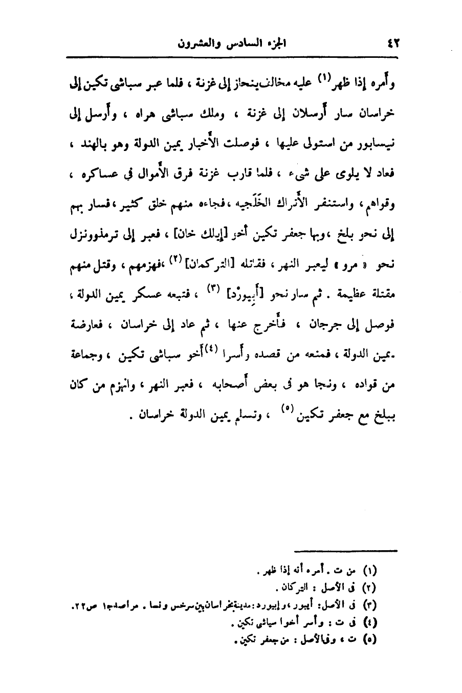وأمره إذا ظهر «1» عليه مخالف ينحاز إلى غزنة، فلما عبر سباشى تكين إلى خراسان سار أرسلان إلى غزنة، وملك سباشى هراه، وأرسل إلى نيسابور من استولى عليها، فوصلت الأخبار يمين الدولة وهو بالهند، فعاد لا يلوى على شىء، فلما قارب غزنة فرق الأموال في عساكره، وقواهم، واستنفر الأتراك الخلجيه، فجاءه منهم خلق كثير، فسار بهم إلى نحو بلخ، وبها جعفر تكين أخو [إيلك خان] ، فعبر إلى تزمذو ونزل نحو «مرو» ليعبر النهر، فقاتله [التركمان] «2» ، فهزمهم، وقتل منهم مقتلة عظيمة. ثم سار نحو [أبيورد] «3» ، فتبعه عسكر يمين الدولة، فوصل إلى جرجان، فأخرج عنها، ثم عاد إلى خراسان، فعارضة- يمين الدولة، فمنعه من قصده وأسرا «4» أخو سباشى تكين، وجماعة من قواده، ونجا هو في بعض أصحابه، فعبر النهر، وانهزم من كان ببلخ مع جعفر تكين «5» ، وتسلم يمين الدولة خراسان.