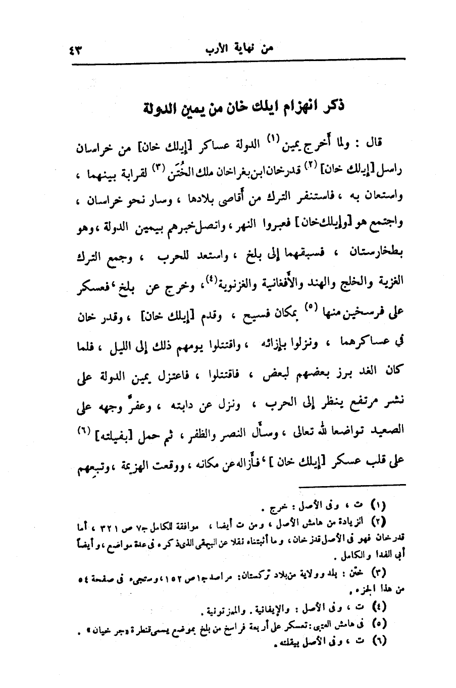 قال: ولما أخرج يمين «1» الدولة عساكر [إيلك خان] من خراسان راسل [إيلك خان] «2» قدر خان ابن بغراخان ملك الختن «3» لقرابة بينهما، واستعان به، فاستنفر الترك من أقاصى بلادها، وسار نحو خراسان، واجتمع هو [وإيلك خان] فعبروا النهر، واتصل خبرهم بيمين الدولة، وهو بطخارستان، فسبقهما إلى بلخ، واستعد للحرب، وجمع الترك الغزية والخلج والهند والأفغانية والغزنوية «4» ، وخرج عن بلخ، فعسكر على فرسخين منها «5» بمكان فسيح، وقدم [إيلك خان] ، وقدرخان فى عساكرهما، ونزلوا بإزائه، واقتتلوا يومهم ذلك إلى الليل، فلما كان الغد برز بعضهم لبعض، فاقتتلوا، فاعتزل يمين الدولة على نشر مرتفع ينظر إلى الحرب، ونزل عن دابته، وعفرّ وجهه على الصعيد تواضعا لله تعالى، وسأل النصر والظفر، ثم حمل [بفيلته] «6» على قلب عسكر [إيلك خان] ، فأزاله عن مكانه، ووقعت الهزيمة، وتبعهم
