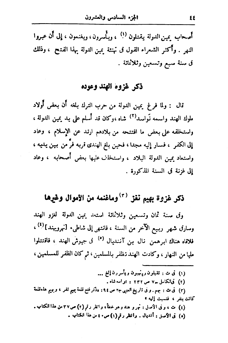وفي سنة ثمان وتسعين وثلاثمائة استعد يمين الدولة لغزو الهند وسار في شهر ربيع الآخر من السنة، فانتهى إلى شاطى، [نهرويهند] «4» ، فلاقاه هناك ابرهمن نال بن آننديال «5» فى جيوش الهند، فاقتتلوا مليا من النهار، وكادت الهند تظفر بالمسلمين، ثم كان الظفر للمسلمين،