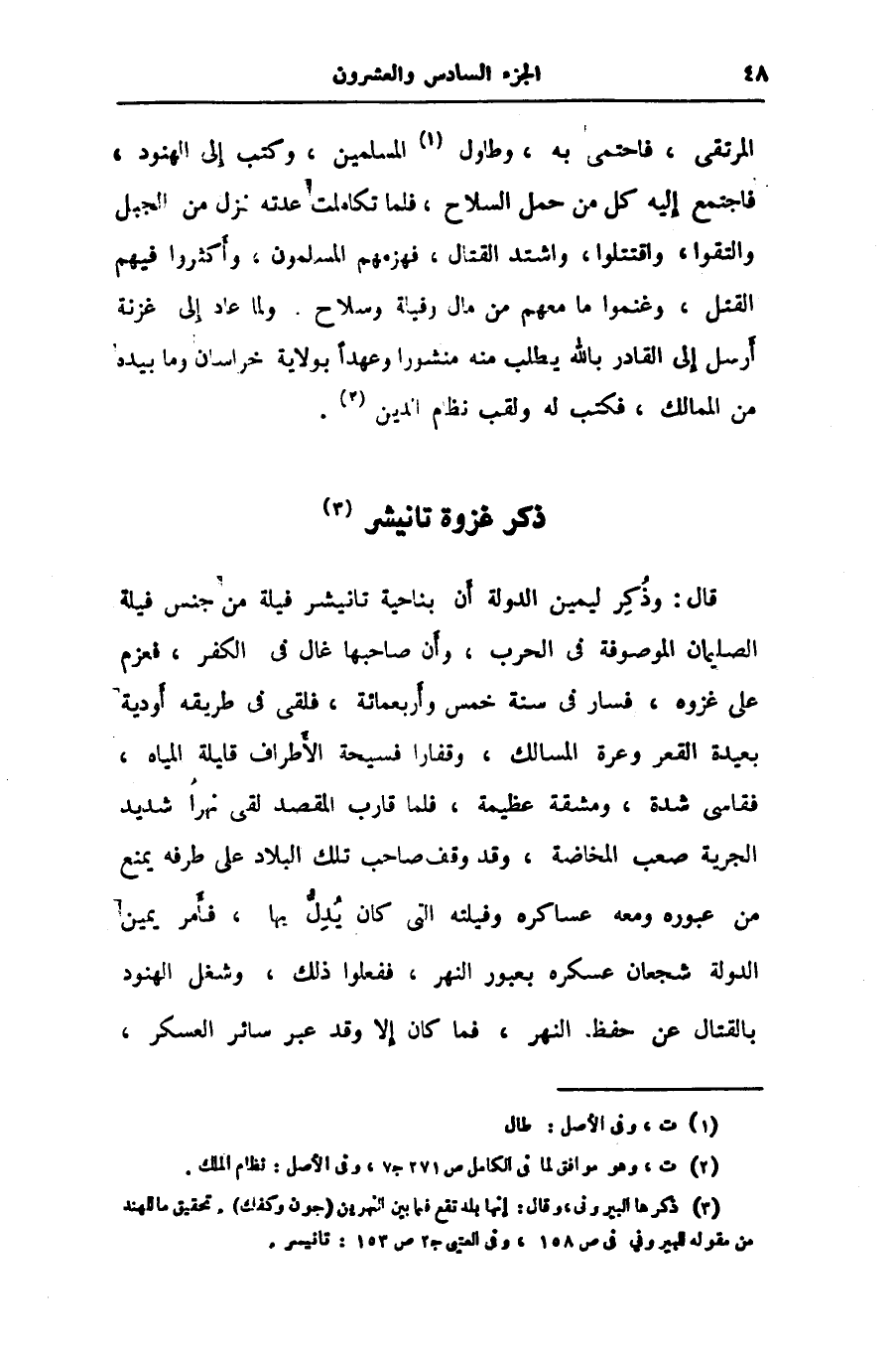 قال: وذكر ليمين الدولة أن بناحية تانيشر فيلة من جنس فيلة الصليمان الموصوفة في الحرب، وأن صاحبها غال في الكفر، فعزم على غزوه، فسار في سنة خمس وأربعمائة، فلقى في طريقه أودية بعيدة القعر وعرة المسالك، وقفارا فسيحة الأطراف قليلة المياه، فقاسى شدة، ومشقة عظيمة، فلما قارب المقصد لقى نهرا شديد الجرية صعب المخاضة، وقد وقف صاحب تلك البلاد على طرفه يمنع من عبوره ومعه عساكره وفيلته التى كان يدلّ بها، فأمر يمين الدولة شجعان عسكره بعبور النهر، ففعلوا ذلك، وشغل الهنود بالقتال عن حفظ النهر، فما كان إلا وقد عبر سائر العسكر،