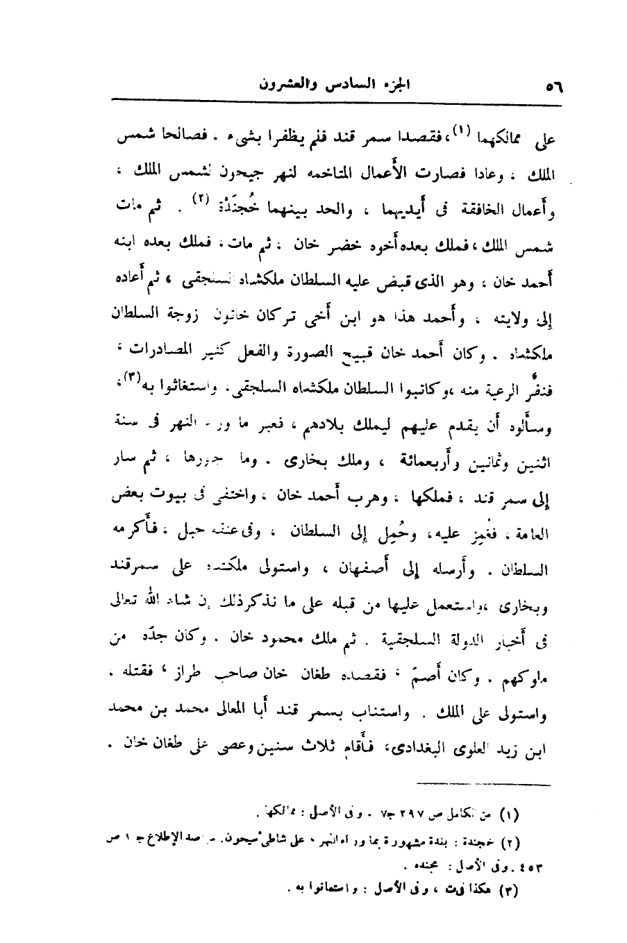 على ممالكهما «1» ، فقصدا سمرقند فلم يظفرا بشىء، فصالحا شمس الملك، وعادا فصارت الأعمال المتاخمه لنهر جيحون لشمس الملك، وأعمال الخافقة في أيديهما، والحد بينهما خجندة «2» . ثم مات شمس الملك، فملك بعده أخوه خضرخان، ثم مات، فملك بعده ابنه أحمدخان، وهو الذى قبض عليه السلطان ملكشاه السلجقى، ثم أعاده إلى ولايته، وأحمد هذا هو ابن أخى تركان خاتون زوجة السلطان ملكشاه، وكان أحمدخان قبيح الصورة والفعل كثير المصادرات، فنفّر الرعية منه، وكاتبوا السلطان ملكشاه السلجقى، واستغاثوا به «3» ، وسألوه أن يقدم عليهم ليملك بلادهم، فعبر ما وراء النهر في سنة اثنين وثمانين وأربعمائة، وملك بخارى. وما جورها، ثم سار إلى سمرقند، فملكها، وهرب أحمد خان، واختفى في بيوت بعض العامة، فغمز عليه، وحمل إلى السلطان، وفي عنقه حبل، فأكرمه السلطان. وأرسله إلى أصفهان، واستولى ملكشاه على سمرقند وبخارى، واستعمل عليها من قبله على ما نذكر ذلك إن شاء الله تعالى في أخبار الدولة السلجقية. ثم ملك محمودخان. وكان جدّه من ملوكهم. وكان أصم، فقصده طغان خان صاحب طراز، فقتله.