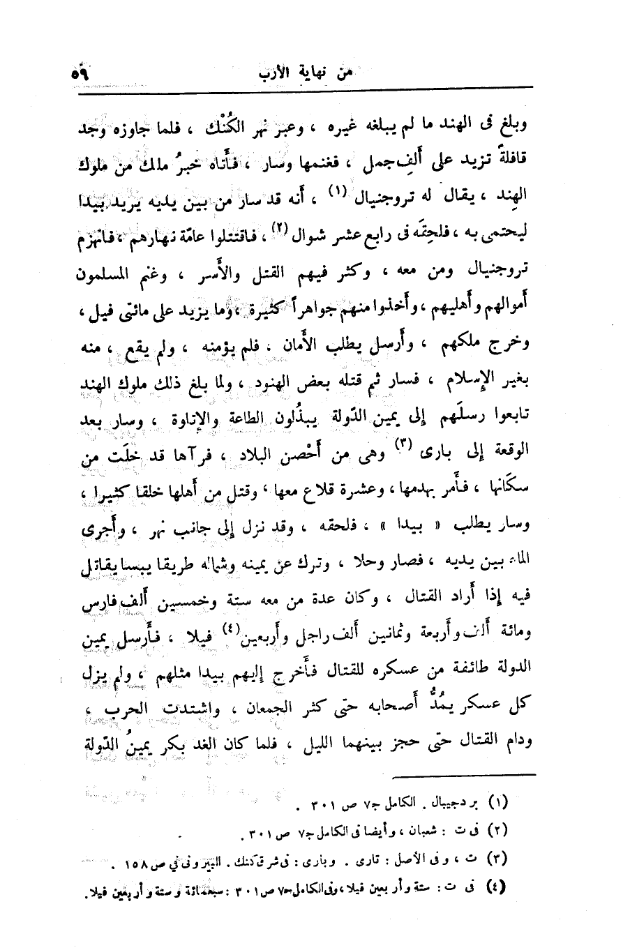 وبلغ في الهند ما لم يبلغه غيره، وعبر نهر الكنك، فلما جاوزه وجد قافلة تزيد على ألف جمل، فغنمها وسار، فأتاه خبر ملك من ملوك الهند، يقال له تروجنيال «1» ، أنه قد سار من بين يديه يريد بيدا ليحتمى به، فلحقه في رابع عشر شوال «2» ، فاقتتلوا عامّة نهارهم، فانهزم تروجنيال ومن معه، وكثر فيهم القتل والأسر، وغنم المسلمون أموالهم وأهليهم، وأخذوا منهم جواهرا كثيرة، وما يزيد على مائتى فيل، وخرج ملكهم، وأرسل يطلب الأمان، فلم يؤمنه، ولم يقع، منه بغير الإسلام، فسار ثم قتله بعض الهنود، ولما بلغ ذلك ملوك الهند تابعوا رسلهم إلى يمين الدّولة يبذلون الطاعة والإتاوة، وسار بعد الوقعة إلى بارى «3» وهى من أحصن البلاد، فرآها قد خلت من سكانها، فأمر بهدمها، وعشرة قلاع معها، وقتل من أهلها خلقا كثيرا، وسار يطلب «بيدا» ، فلحقه، وقد نزل إلى جانب نهر، وأجرى الماء بين يديه، فصار وحلا، وترك عن يمينه وشماله طريقا يبسا يقاتل فيه إذا أراد القتال، وكان عدة من معه ستة وخمسين ألف فارس ومائة ألف وأربعة وثمانين ألف راجل وأربعين «4» فيلا، فأرسل يمين الدولة طائفة من عسكره للقتال فأخرج إليهم بيدا مثلهم، ولم يزل كل عسكر يمدّ أصحابه حتى كثر الجمعان، واشتدت الحرب، ودام القتال حتى حجز بينهما الليل، فلما كان الغد بكر يمين الدّولة