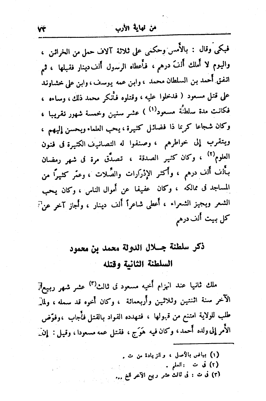 فبكى وقال: بالأمس وحكمى على ثلاثة آلاف حمل من الخزائن، واليوم لا أملك ألف درهم، فأعطاه الرسول ألف دينار فقبلها، ثم اتفق أحمد بن السلطان محمد، وابن عمه يوسف، وابن على خشاوند على قتل مسعود (فدخلوا عليه، وقتلوه فأنكر محمد ذلك، وساءه، فكانت مدة سلطنة مسعود «1» عشر سنين وخمسة شهور تقريبا، وكان شجاعا كريما ذا فضائل كثيرة، يحب العلماء ويحسن إليهم، ويتقرب إلى خواطرهم، وصنفوا له التصانيف الكثيرة في فنون العلوم «2» ، وكان كثير الصدقة، تصدّق مرة في شهر رمضان بألف ألف درهم، وأكثر الإدرارات والصّلات، وعمّر كثيرا من المساجد في ممالكه، وكان عفيفا عن أموال الناس، وكان يحب الشعر ويجيز الشعراء، أعطى شاعرا ألف دينار، وأجاز آخر عن كل بيت ألف درهم