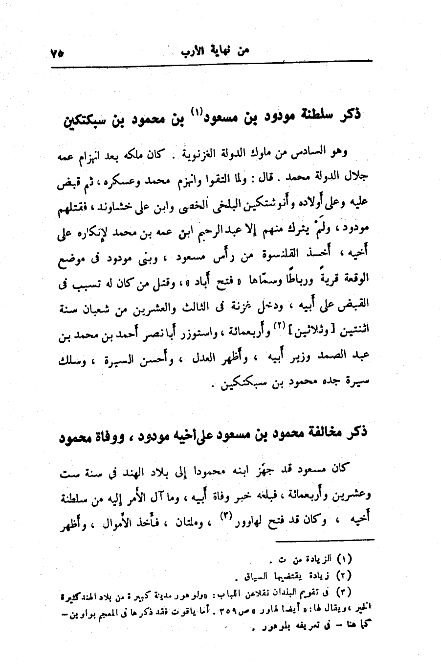 كان مسعود قد جهّز ابنه محمودا إلى بلاد الهند في سنة ست وعشرين وأربعمائة، فبلغه خبر وفاة أبيه، وما آل الأمر إليه من سلطنة أخيه، وكان قد فتح لهاوور «3» ، وملتان، فأخذ الأموال، وأظهر