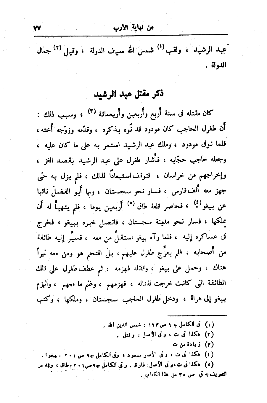 أن طغرل الحاجب كان مودود قد نوه بذكره، وقدّمه وزوّجه أخته، فلما توفى مودود، وملك عبد الرشيد استمر به على ما كان عليه، وجعله حاجب حجّابه، فأشار طغرل على عبد الرشيد بقصد الغز، وإخراجهم من خراسان، فتوقف استبعادا لذلك، فلم يزل به حتى جهز معه ألف فارس، فسار نحو سجستان، وبها أبو الفضل نائبا عن بيغو «4» ، فحاصر قلعة طاق «5» أربعين يوما، فلم يتهيأ له أن يملكها، فسار نحو مدينة سجستان، فاتصل خبره ببيغو، فخرج فى عساكره إليه، فلما رآه بيغو استقلّ من معه، فسيّر إليه طائفة من أصحابه، فلم يعرّج طغرل عليهم، بل اقتحم هو ومن معه نهرا هناك، وحمل على بيغو، وقاتله فهزمه، ثم عطف طغرل على تلك الطائفة التى كانت خرجت لقتاله، فهزمهم، وغنم ما معهم، وانهزم بيغو إلى هراة، ودخل طغرل الحاجب سجستان، وملكها، وكتب