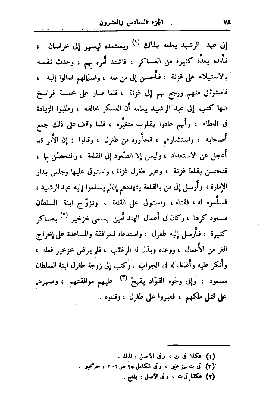 إلى عبد الرشيد يعلمه بذلك «1» ويستمده ليسير إلى خراسان، فأمده بعدّة كثيرة من العساكر، فاشتد أمره بهم، وحدث نفسه بالاستيلاء على غزنة، فأحسن إلى من معه، واستمالهم فمالوا إليه، فاستوثق منهم ورجع بهم إلى غزنة، فلما صار على خمسة فراسخ منها كتب إلى عبد الرشيد يعلمه أن العسكر خالفه، وطلبوا الزيادة فى العطاء، وأنهم عادوا بقلوب متغيّره، فلما وقف على ذلك جمع أصحابه، واستشارهم، فحذّروه من طغرل، وقالوا: إن الأمر قد أعجل عن الاستعداد، وليس إلا الصّعود إلى القلعة، والتحصّن بها، فتحصن بقلعة غزنة، وعبر طغرل غزنة، واستولى عليها وجلس بدار الإمارة، وأرسل إلى من بالقلعة يتهددهم إن لم يسلموا إليه عبد الرشيد، فسلّموه له، فقتله، واستولى على القلعة، وتزوّج ابنة السلطان مسعود كرها، وكان في أعمال الهند أمين يسمى خزخير «2» بعساكر كثيرة، فأرسل إليه طغرل، واستدعاه للموافقة والمساعدة على إخراج الغز من الأعمال، ووعده وبذل له الرغائب، فلم يرض خزخير فعله، وأنكر عليه وأغلظ له في الجواب، وكتب إلى زوجة طغرل ابنة السلطان مسعود، وإلى وجوه القوّاد يقبحّ «3» عليهم موافقتهم، وصبرهم على قتل ملكهم، فعبروا على طغرل، وقتلوه.