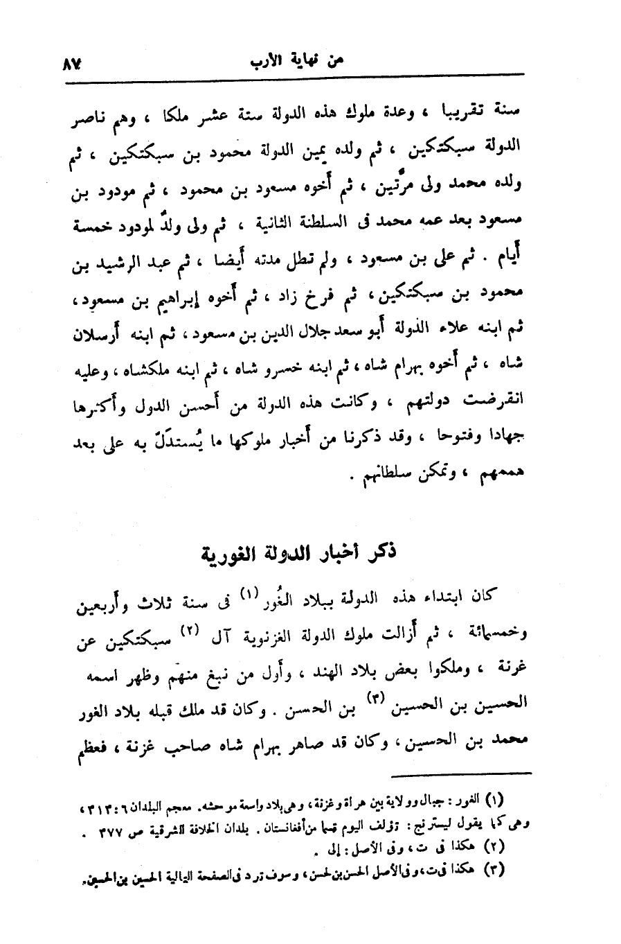 كان ابتداء هذه الدولة ببلاد الغور «1» فى سنة ثلاث وأربعين وخمسمائة، ثم أزالت ملوك الدولة الغزنوية آل «2» سبكتكين عن غرنة، وملكوا بعض بلاد الهند،