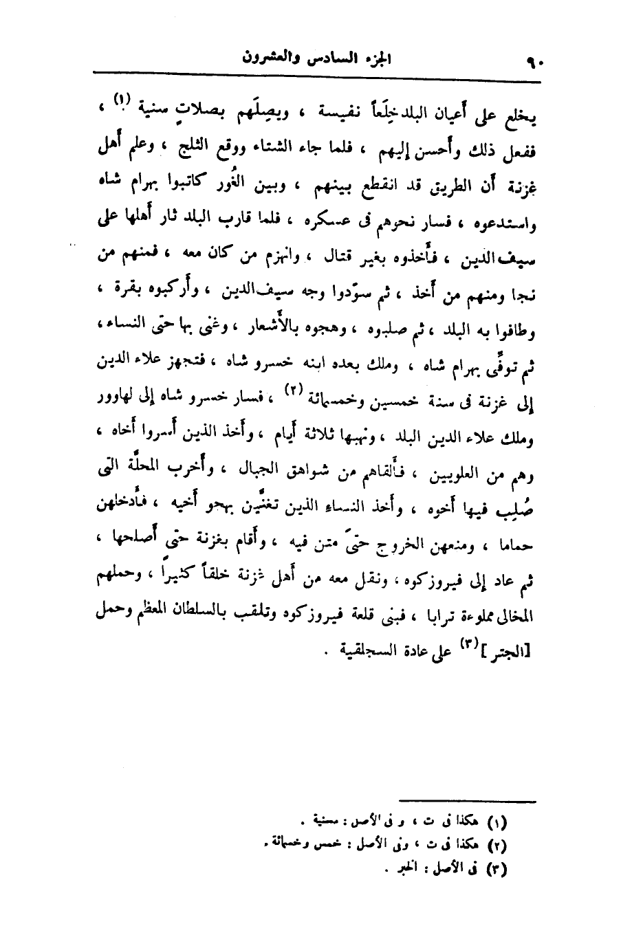 يخلع على أعيان البلد خلعا نفيسة، ويصلهم بصلات سنية «1» ، ففعل ذلك وأحسن إليهم، فلما جاء الشتاء ووقع الثلج، وعلم أهل غزنة أن الطريق قد انقطع بينهم، وبين الغور كاتبوا بهرام شاه واستدعوه، فسار نحوهم في عسكره، فلما قارب البلد ثار أهلها على سيف الدين، فأخذوه بغير قتال، وانهزم من كان معه، فمنهم من نجا ومنهم من أخذ، ثم سوّدوا وجه سيف الدين، وأركبوه بقرة، وطافوا به البلد، ثم صلبوه، وهجوه بالأشعار، وغنى بها حتى النساء، ثم توفّى بهرام شاه، وملك بعده ابنه خسروشاه، فتجهز علاء الدين إلى غزنة في سنة خمسين وخمسمائة «2» ، فسار خسروشاه إلى لهاوور وملك علاء الدين البلد، ونهبها ثلاثة أيام، وأخذ الذين أسروا أخاه، وهم من العلويين، فألقاهم من شواهق الجبال، وأخرب المحلّة التى صلب فيها أخوه، وأخذ النساء الذين تغنّين بهجو أخيه، فأدخلهن حماما، ومنعهن الخروج حتّى متن فيه، وأقام بغزنة حتى أصلحها، ثم عاد إلى فيروزكوه، ونقل معه من أهل غزنة خلقا كثيرا، وحملهم المخالى مملوءة ترابا، فبنى قلعة فيروزكوه وتلقب بالسلطان المعظم وحمل [الجتر] «3» على عادة السجلقية.