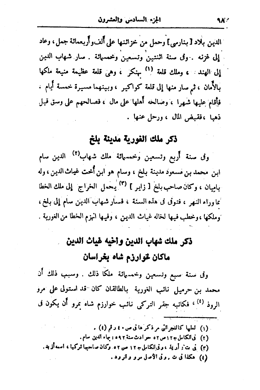 وفي سنة أربع وتسعين وخمسمائة ملك شهاب «2» الدين سام ابن محمد بن مسعود مدينة بلخ، وسام هو ابن أخت غياث الدين، وله باميان، وكان صاحب بلخ [زاير] «3» يحمل الخراج إلى ملك الخطا بما وراء النهر، فتوفى في هذه السنة، فسار شهاب الدين سام إلى بلخ، وملكها، وخطب فيها لخاله غياث الدين، وفيها انهزم الخطا من الغورية.
