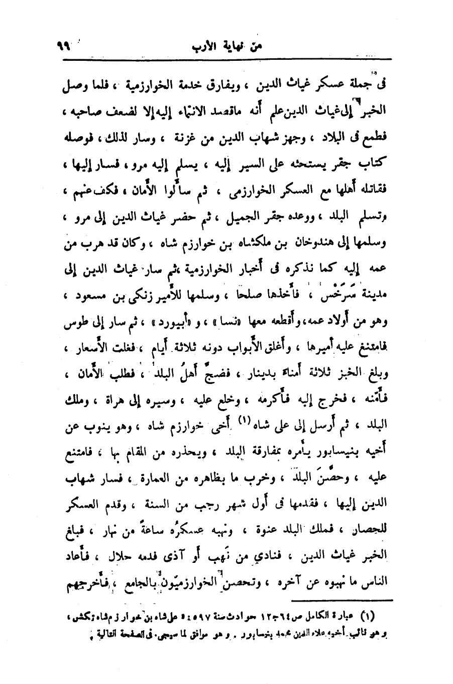 فى جملة عسكر غياث الدين، ويفارق خدمة الخوارزمية، فلما وصل الخبر إلى غياث الدين علم أنّه ما قصد الانتماء إليه إلا لضعف صاحبه، فطمع في البلاد، وجهز شهاب الدين من غزنة، وسار لذلك، فوصله كتاب جقر يستحثه على السير إليه، يسلم إليه مرو، فسار إليها، فقاتله أهلها مع العسكر الخوارزمى، ثم سألوا الأمان» فكف عنهم، وتسلم البلد، ووعده جقر الجميل، ثم حضر غياث الدين إلى مرو، وسلمها إلى هندوخان بن ملكشاه بن خوارزم شاه، وكان قد هرب من عمه إليه كما نذكره في أخبار الخوارزمية، ثم سار غياث الدين إلى مدينة سرخس، فأخذها صلحا، وسلمها للأمير زنكى بن مسعود، وهو من أولاد عمه، وأقطعه معها «نسا» ، و «أبيورد» ، ثم سار إلى طوس فامتنغ عليه أميرها، وأغلق الأبواب دونه ثلاثة أيام، فغلت الأسعار، وبلغ الخبز ثلاثة أمناء بدينار، فضجّ أهل البلد، فطلب الأمان، فأمّنه، فخرج إليه فأكرمه، وخلع عليه، وسيره إلى هراة، وملك البلد، ثم أرسل إلى على شاه «1» أخى خوارزم شاه، وهو ينوب عن أخيه بنيسابور يأمره بمفارقة البلد، ويحذره من المقام بها، فامتنع عليه، وحصّن البلد، وخرب ما بظاهره من العمارة، فسار شهاب الدين إليها، فقدمها في أول شهر رجب من السنة، وقدم العسكر للحصار، فملك البلد عنوة، ونهبه عسكره ساعة من نهار، فبلغ الخبر غياث الدين، فنادى من نهب أو آذى فدمه حلال، فأعاد الناس ما نهبوه عن آخره، وتحصن الخوارزميّون بالجامع، فأخرجهم