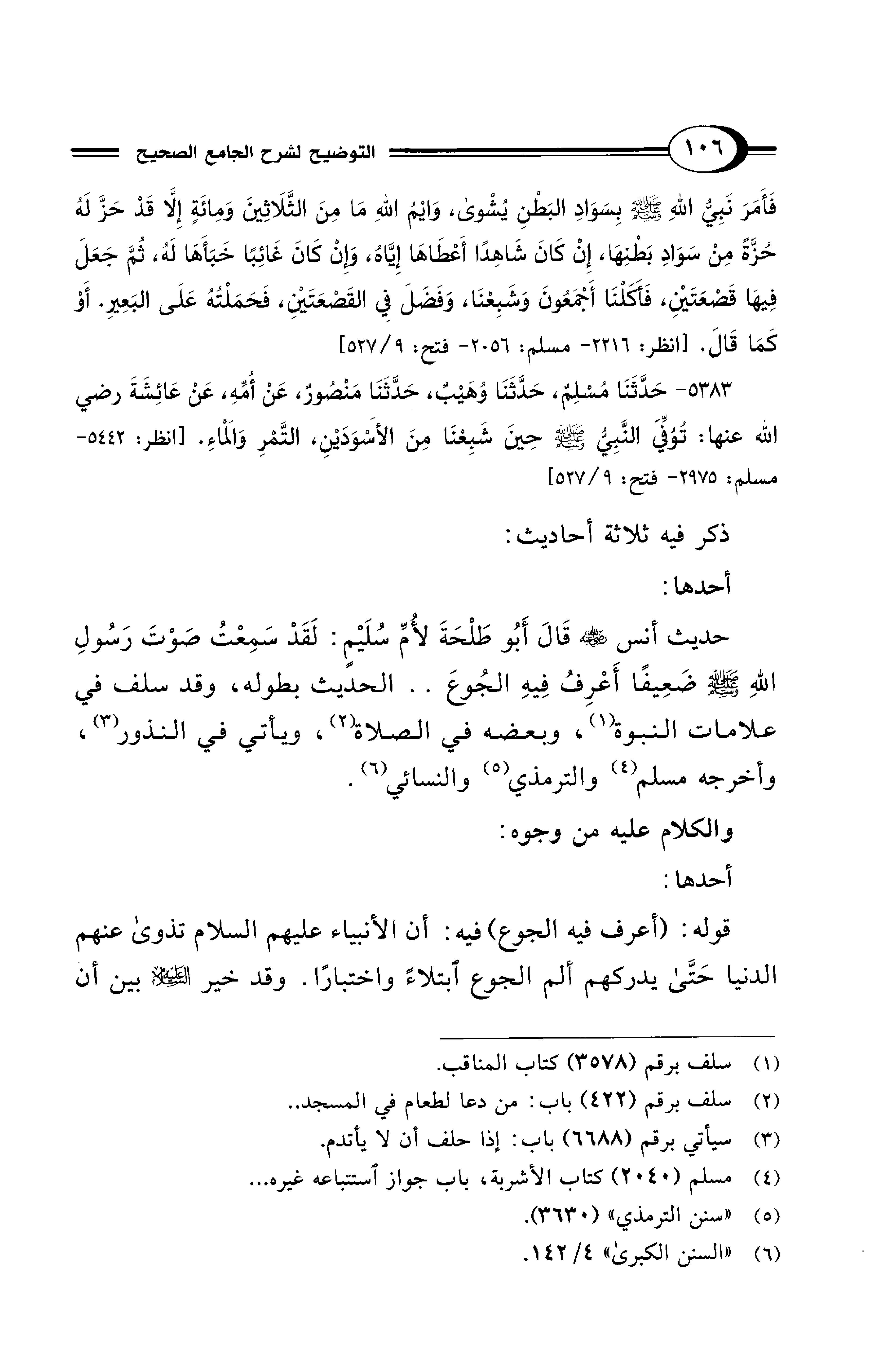 حديث أنس - رضي الله عنه -قَالَ أَبُو طَلْحَةَ لأُمِّ سُلَيْمٍ: لَقَدْ سَمِعْتُ صَوْتَ رَسُولِ اللهِ - صلى الله عليه وسلم - ضَعِيفًا أَعْرِفُ فِيهِ الجُوعَ .. الحديث بطوله، وقد سلف في علامات النبوة (¬1)، وبعضه في الصلاة (¬2)، ويأتي في النذور (¬3)، وأخرجه مسلم (¬4) والترمذي (¬5) والنسائي (¬6).
