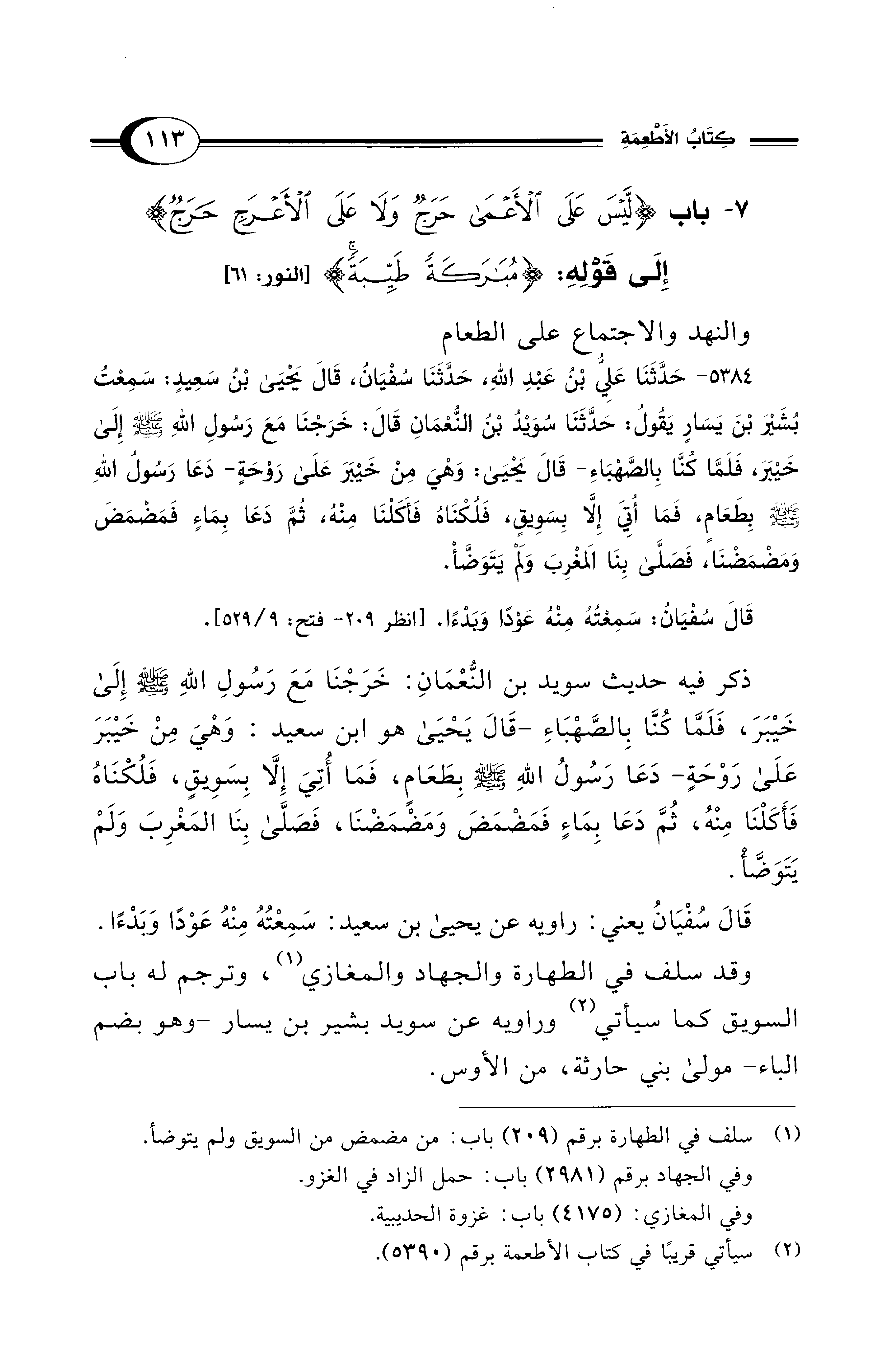 7 - باب {لَيْسَ عَلَى الْأَعْمَى حَرَجٌ وَلَا عَلَى الْأَعْرَجِ حَرَجٌ} إلى قَوْلِهِ: {مُبَارَكَةً طَيِّبَةً} [النور:61]