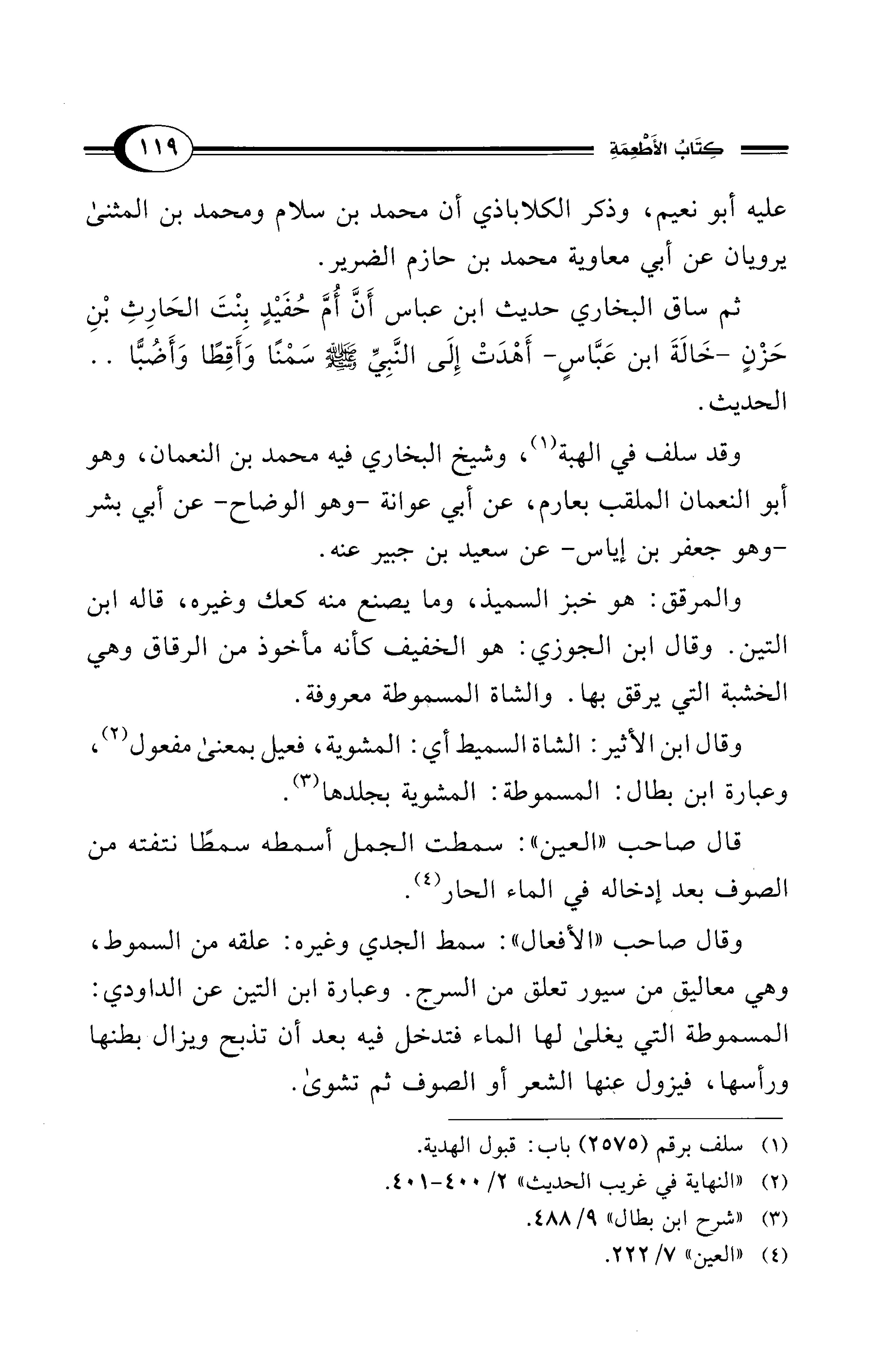 ثم ساق البخاري حديث ابن عباس أَنَّ أُمَّ حُفَيْدٍ بِنْتَ الحَارِثِ بْنِ حَزْنٍ -خَالَةَ ابن عَبَّاسٍ- أَهْدَتْ إِلَى النَّبِيِّ - صلى الله عليه وسلم - سَمْنًا وَأَقِطًا وَأَضُبًّا .. الحديث.
