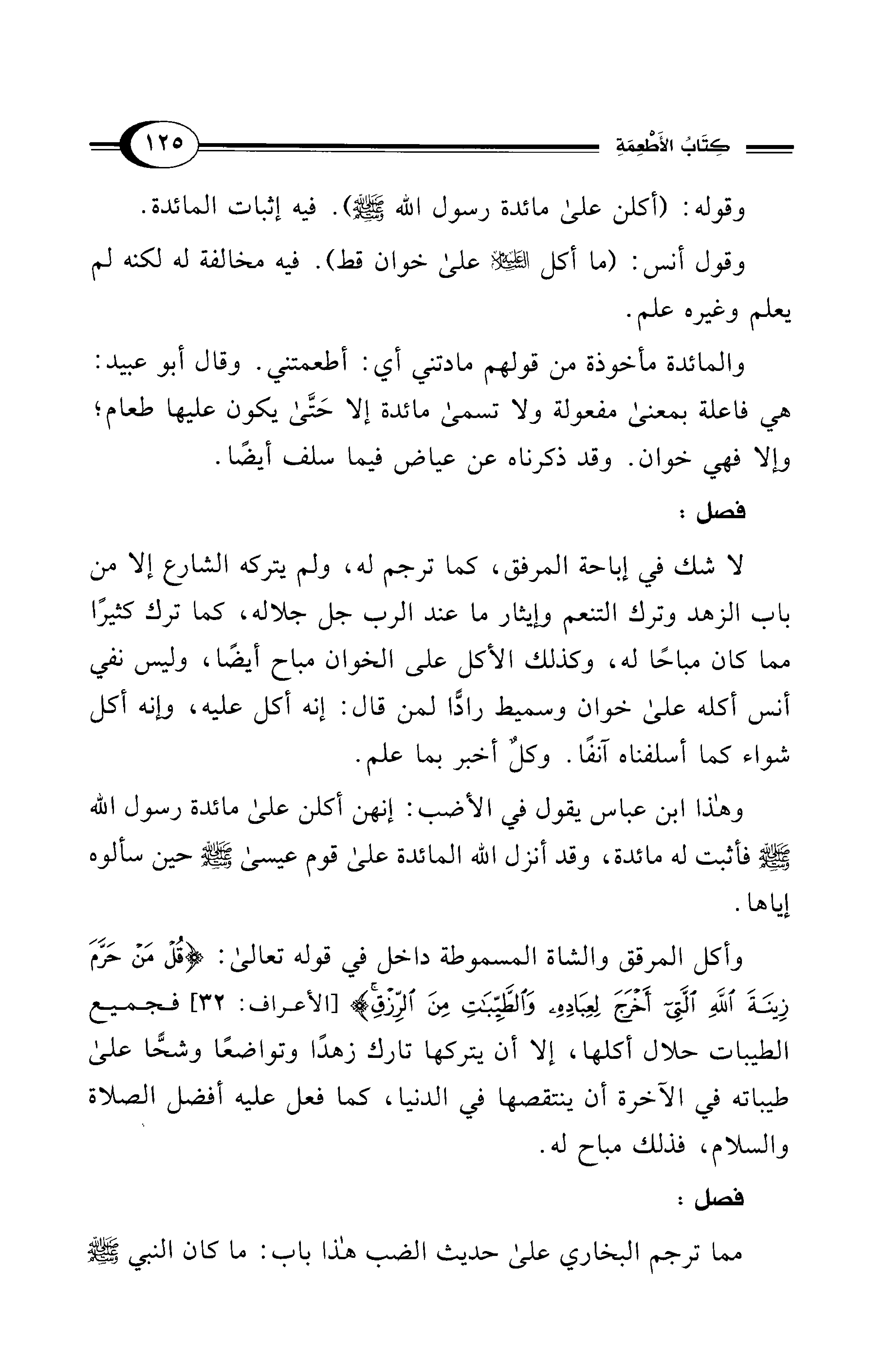 لا شك في إباحة المرفق، كما ترجم له، ولم يتركه الشارع إلا من باب الزهد وترك التنعم وإيثار ما عند الرب جل جلاله، كما ترك كثيراً مما كان مباحًا له، وكذلك الأكل على الخوان مباح أيضًا، وليس نفي أنس أكله على خوان وسميط رادًّا لمن قال: إنه أكل عليه، وإنه أكل شواء كما أسلفناه آنفًا. وكلٌ أخبر بما علم.