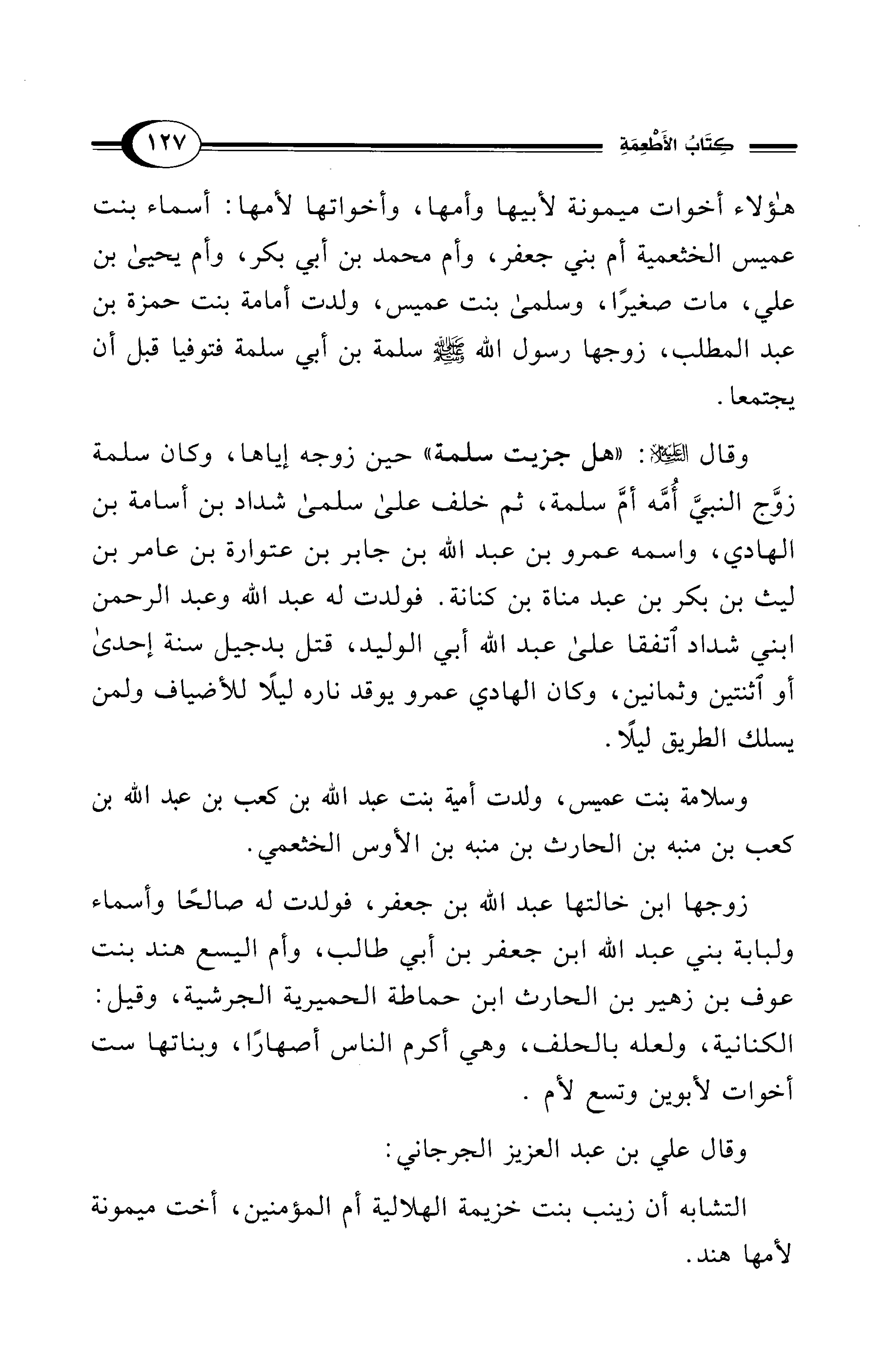 وقال - عليه السلام -: "هل جزيت سلمة" حين زوجه إياها، وكان سلمة زوَّج النبيَّ أُمَّه أمَّ سلمة، ثم خلف على سلمى شداد بن أسامة بن الهادي، واسمه عمرو بن عبد الله بن جابر بن عتوارة بن عامر بن ليث بن بكر بن عبد مناة بن كنانة. فولدت له عبد الله وعبد الرحمن ابني شداد اتفقا على عبد الله أبي الوليد، قتل بدجيل سنة إحدى أو اثنتين وثمانين، وكان الهادي عمرو يوقد ناره ليلاً للأضياف ولمن يسلك الطريق ليلاً.