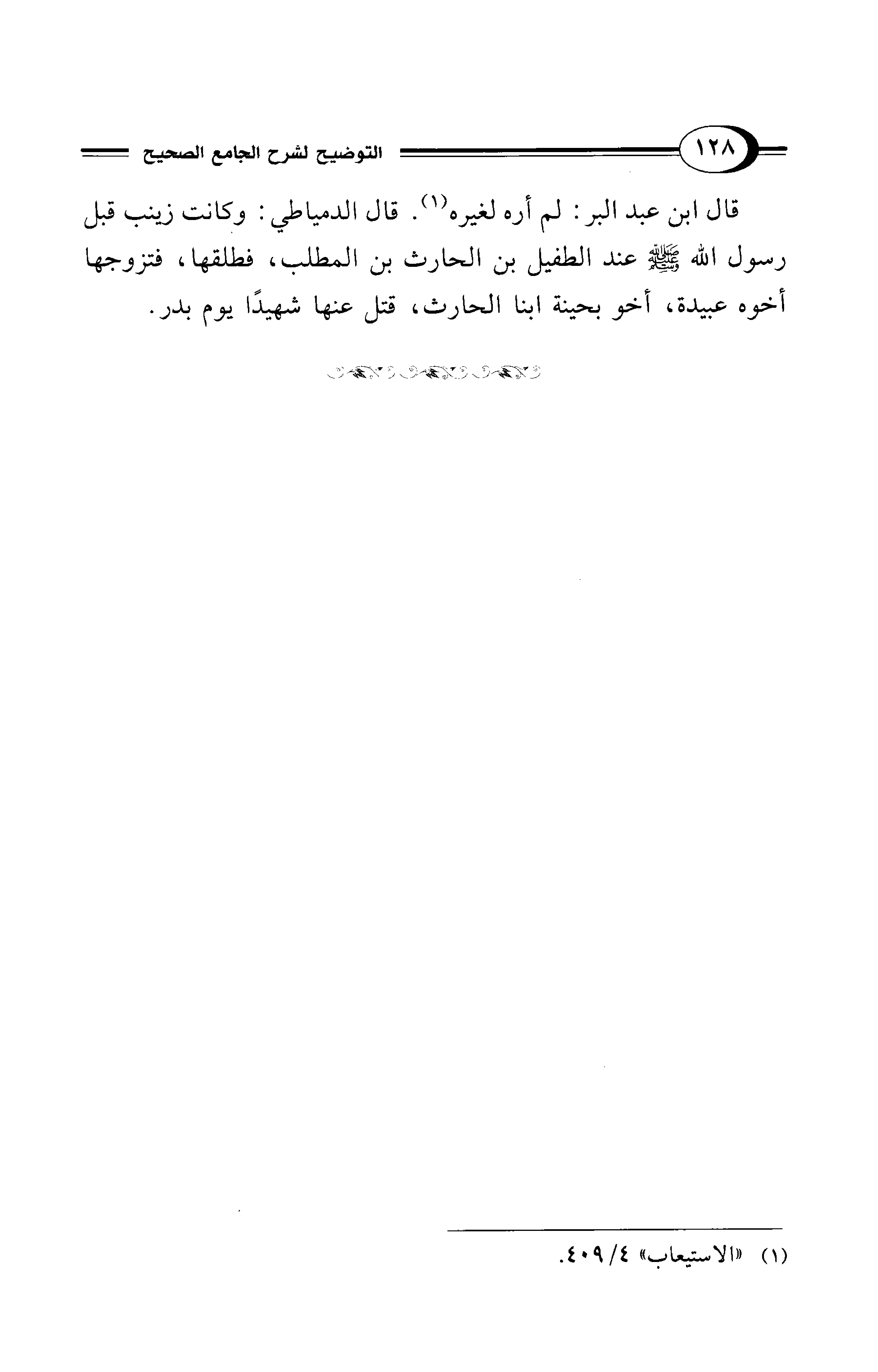 قال ابن عبد البر: لم أره لغيره (¬1). قال الدمياطي: وكانت زينب قبل رسول الله - صلى الله عليه وسلم - عند الطفيل بن الحارث بن المطلب، فطلقها، فتزوجها أخوه عبيدة، أخو بحينة ابنا الحارث، قتل عنها شهيدًا يوم بدر.