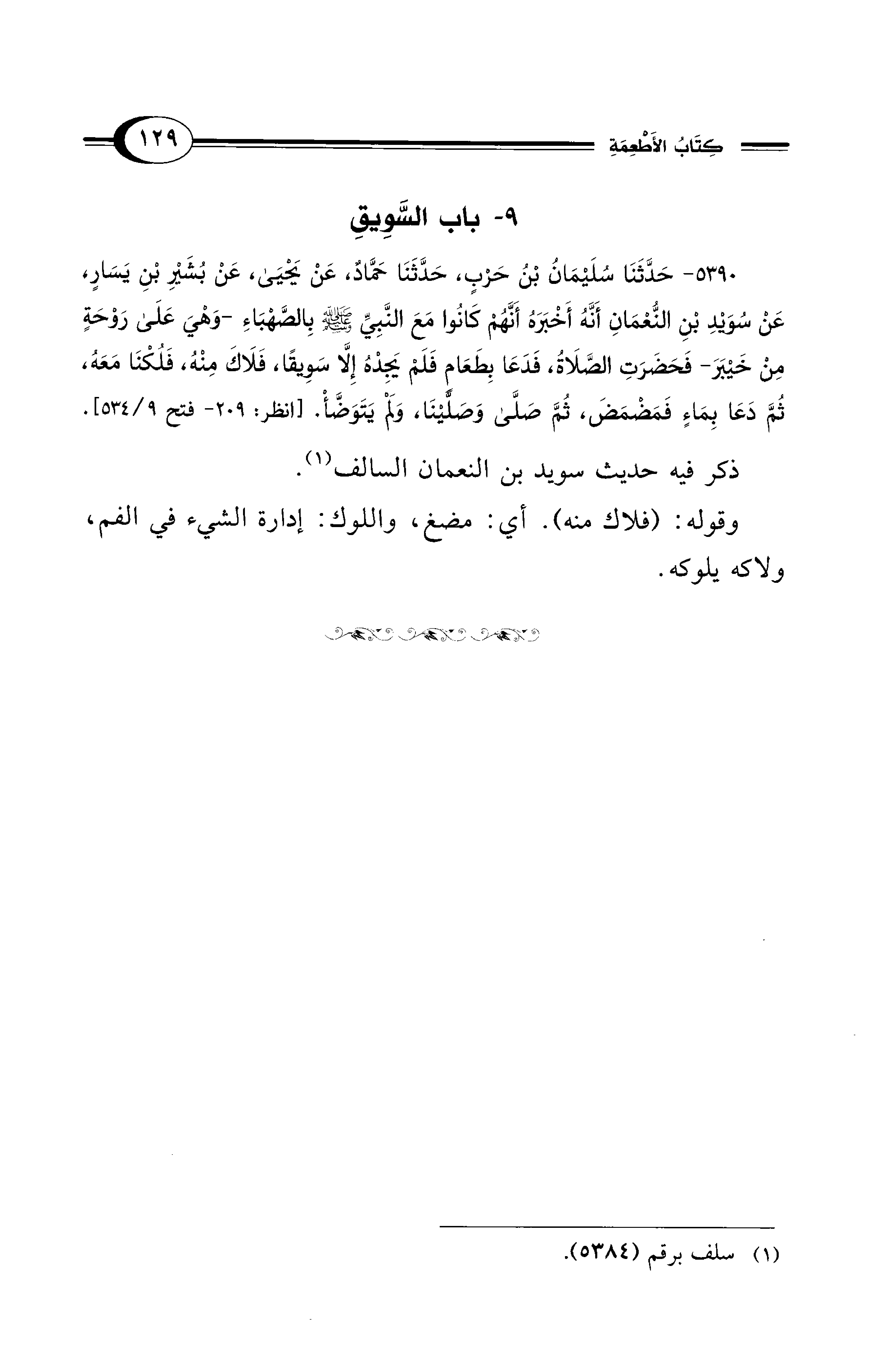 5390 - حَدَّثَنَا سُلَيْمَانُ بْنُ حَرْبٍ، حَدَّثَنَا حَمَّادٌ، عَنْ يَحْيَى، عَنْ بُشَيْرِ بْنِ يَسَارٍ، عَنْ سُوَيْدِ بْنِ النُّعْمَانِ أَنَّهُ أَخْبَرَهُ أَنَّهُمْ كَانُوا مَعَ النَّبِيِّ - صلى الله عليه وسلم - بِالصَّهْبَاءِ -وَهْيَ على رَوْحَةٍ مِنْ خَيْبَرَ- فَحَضَرَتِ الصَّلاَةُ، فَدَعَا بِطَعَامٍ فَلَمْ يَجِدْهُ إِلاَّ سَوِيقًا، فَلاَكَ مِنْهُ، فَلُكْنَا مَعَهُ، ثُمَّ دَعَا بِمَاءٍ فَمَضْمَضَ، ثُمَّ صَلَّى وَصَلَّيْنَا، وَلَمْ يَتَوَضَّأْ. [انظر: 209 - فتح 9/ 534].